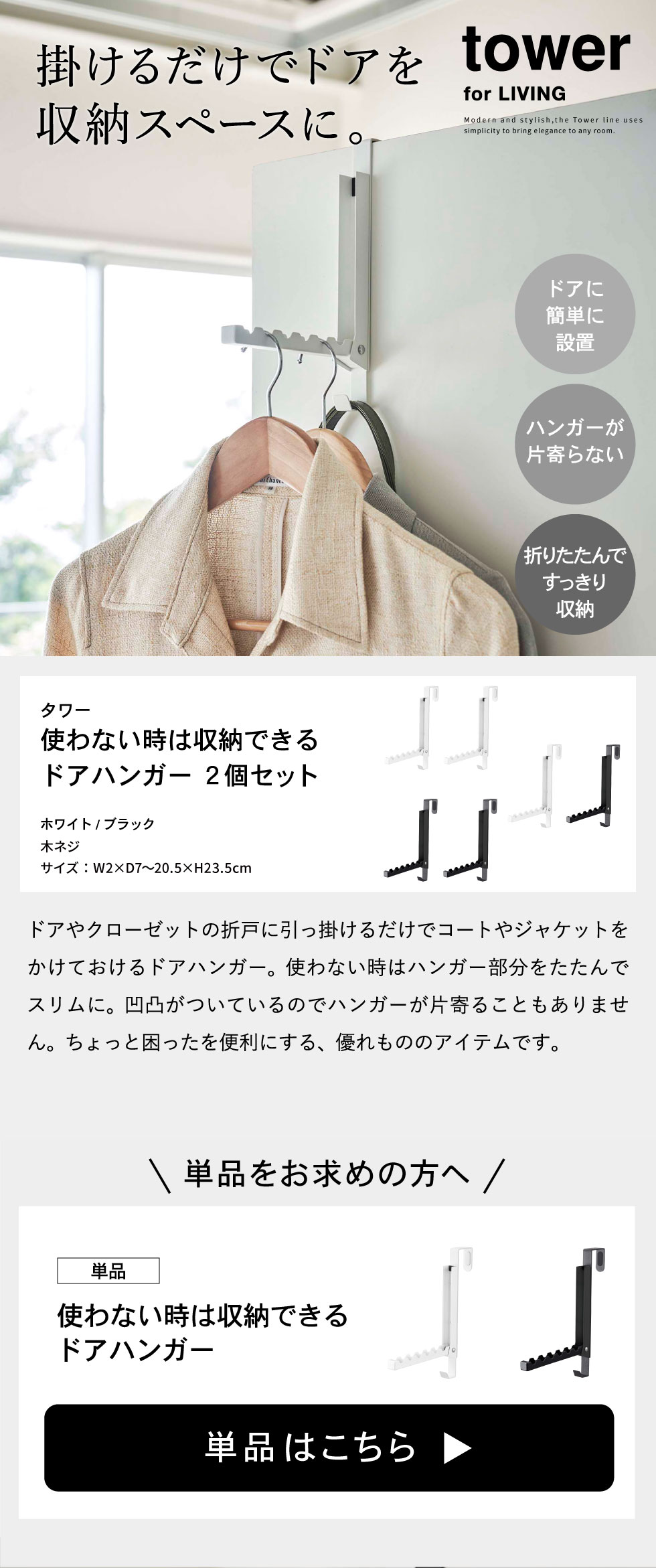 使わない時は収納できるドアハンガー タワー 2個セット 山崎実業 tower ホワイト/ブラック 5514 5515 タワーシリーズ
