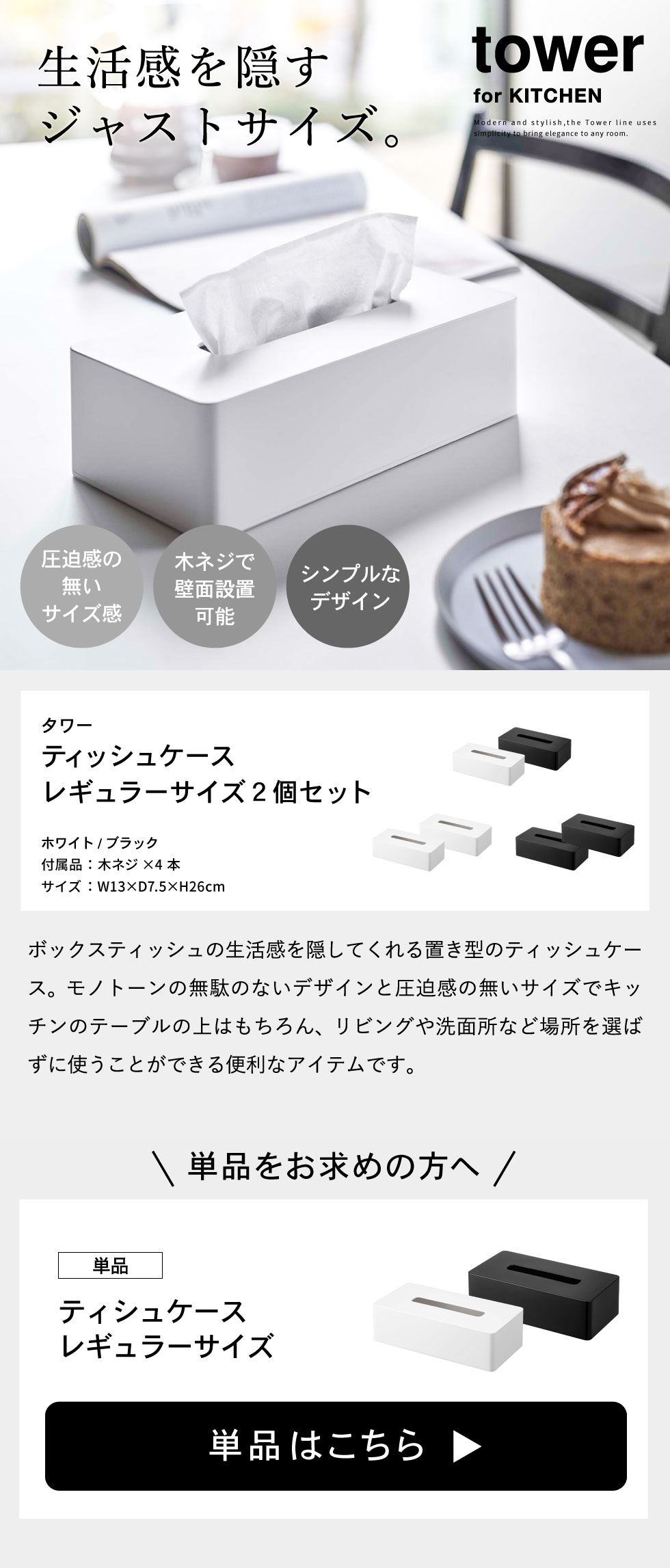 ●対応サイズ:高さ約7cmまでの一般的なティッシュボックス ※枚数の目安:200組(400枚)以内
