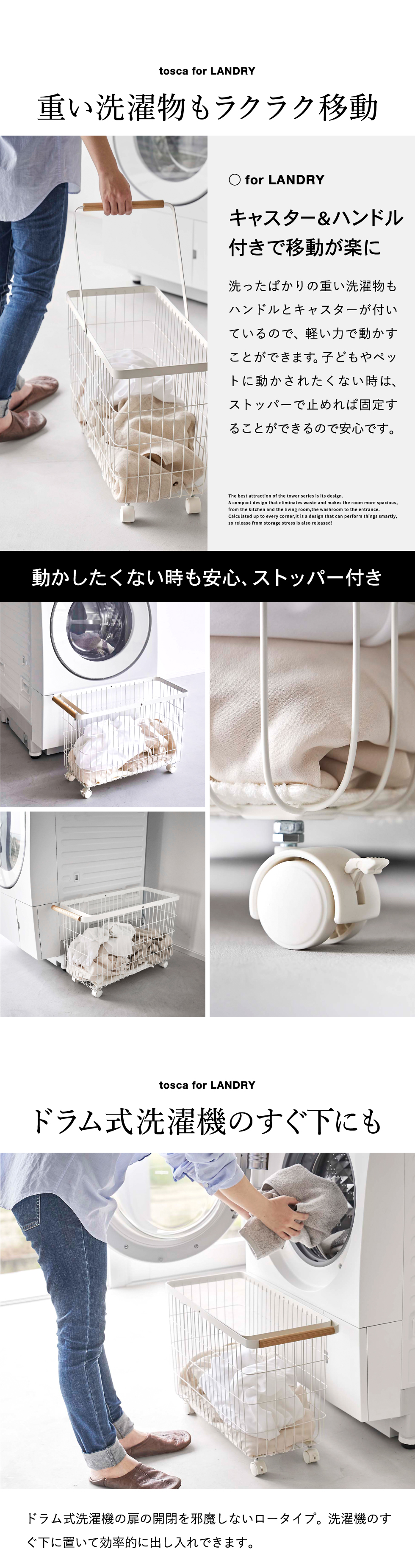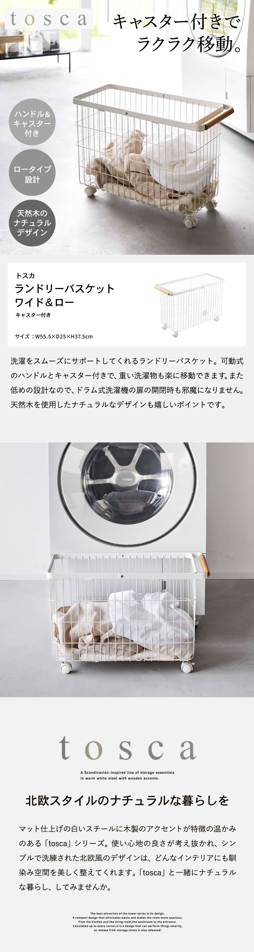 洗濯機の幅に合うワイドなキャスター付きランドリーバスケット。扉(ドラム式洗濯機)の開閉の邪魔にならない高さ設計。扉の開閉の邪魔にならないので洗濯物の出し入れもスムーズ。移動に便利な可動式のハンドル付き。天然木のハンドルがアクセント。