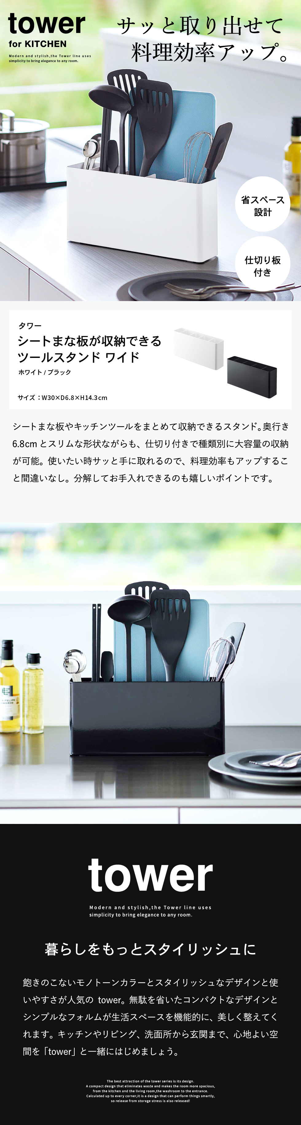 ホワイトとブラックを中心とした飽きのこないモノトーンカラーと、どんなインテリアにもスッと馴染むスタイリッシュなデザイン。そして、とことんシンプルながら、より豊かな暮らしを提案するアイデアがたくさん詰まった、使いやすいアイテムが人気です。無駄を省いたコンパクトなデザインと、シンプルなフォルムが生活スペースを機能的に、美しく整えてくれます。towerのアイテムをライン使いすれば、すっきりとした統一感が生まれ、お洒落でシックな雰囲気を演出します。キッチンやリビング、洗面所から玄関まで揃えたくなるtowerシリーズで、毎日の暮らしを彩る心地よい空間を。