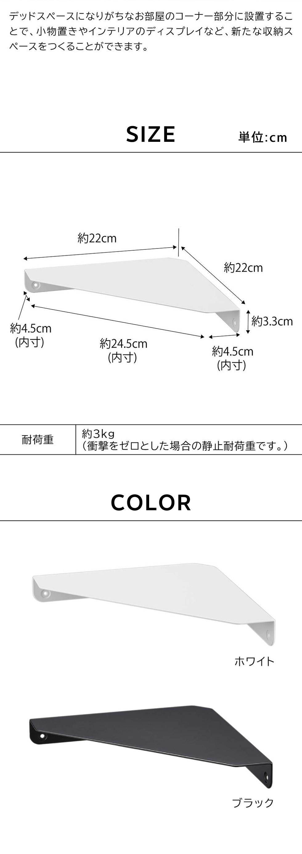 デッドスペースになりがちなお部屋のコーナー部分に設置することで、新たな雰囲気の空間が生まれます。ベッドサイドでは時計やメガネ、寝る前に読む文庫本を置いたり、トイレではディフューザーやスプレー、予備のトイレットペーパーやサニタリー用品を置いたりなど。耐荷重も約3kgと充分で、用途に応じて活躍の場は広がります。小さなスペースをお気に入りの空間に変身させてみませんか?