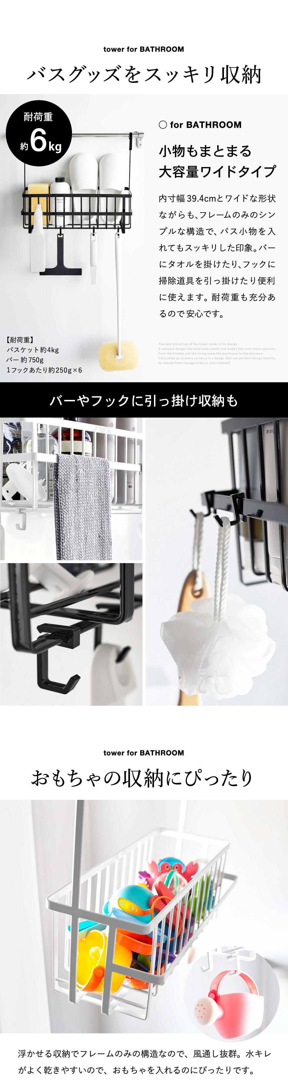 内寸幅39.4cmとワイドな形状ながらも、フレームのみのシンプルな構造で、散らかりがちなバス小物を入れてもスッキリした印象。バーにタオルを掛けたり、フックに掃除道具を引っ掛けたり便利に使えます。耐荷重も充分あるので安心です。