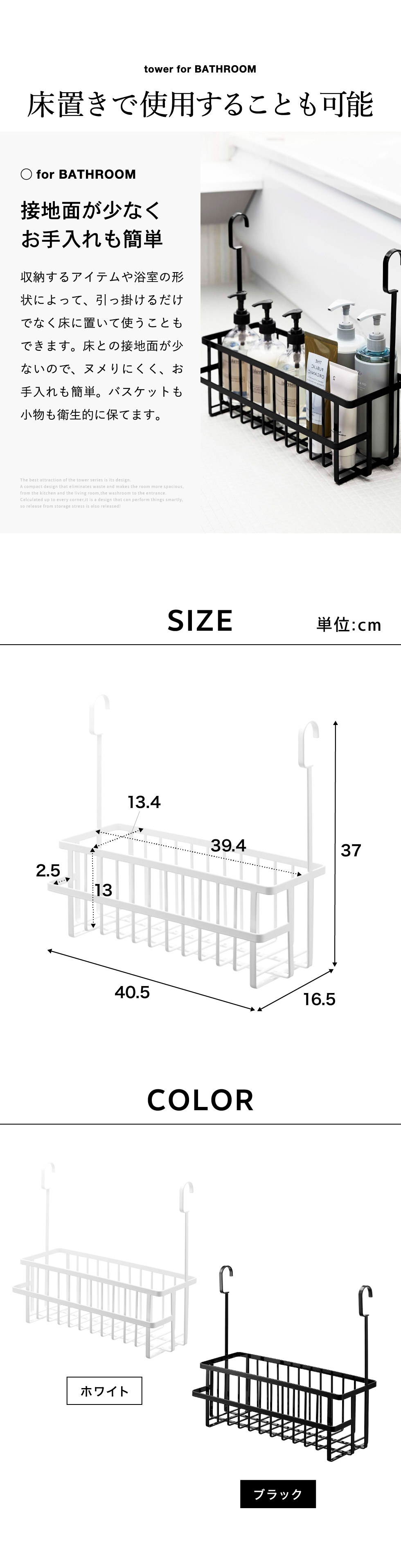 収納するアイテムや浴室の形状によって、引っ掛けるだけでなく床に置いて使うこともできます。床との接地面が少ないので、ヌメりにくく、お手入れも簡単。バスケットも小物も衛生的に保てます。