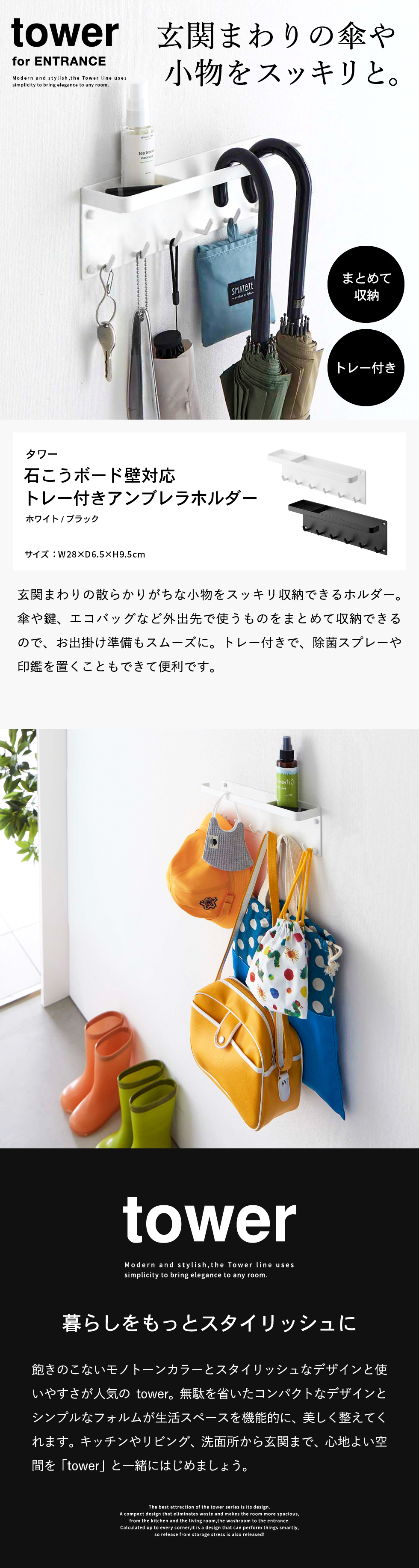 ホワイトとブラックを中心とした飽きのこないモノトーンカラーと、どんなインテリアにもスッと馴染むスタイリッシュなデザイン。そして、とことんシンプルながら、より豊かな暮らしを提案するアイデアがたくさん詰まった、使いやすいアイテムが人気です。無駄を省いたコンパクトなデザインと、シンプルなフォルムが生活スペースを機能的に、美しく整えてくれます。towerのアイテムをライン使いすれば、すっきりとした統一感が生まれ、お洒落でシックな雰囲気を演出します。キッチンやリビング、洗面所から玄関まで揃えたくなるtowerシリーズで、毎日の暮らしを彩る心地よい空間を。