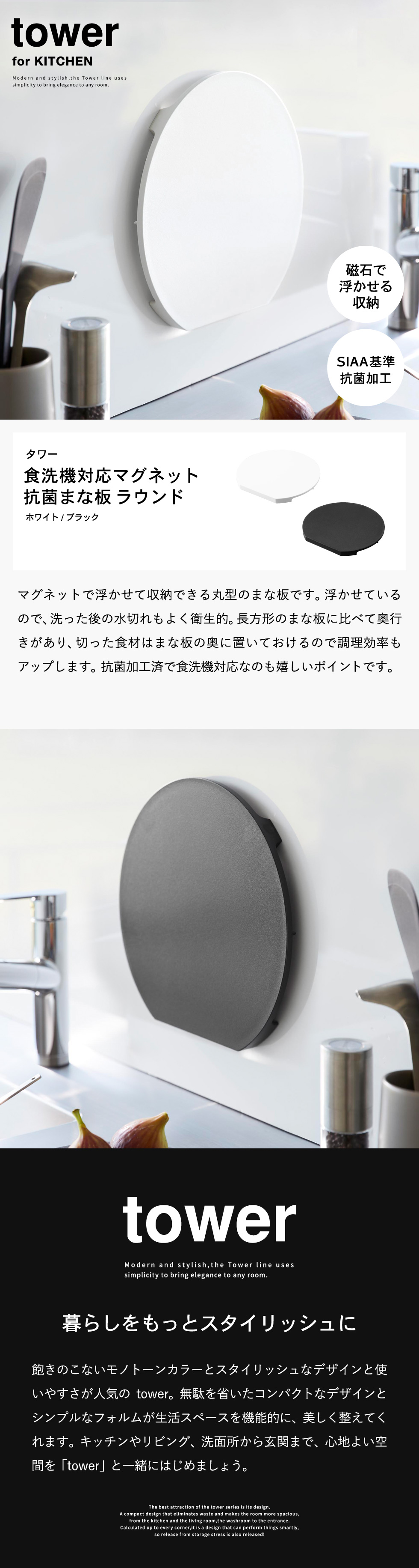 山崎実業 tower 食洗機対応 マグネット抗菌まな板 タワー ラウンド 山崎実業 tower 7014 7015 ホワイト ブラック
