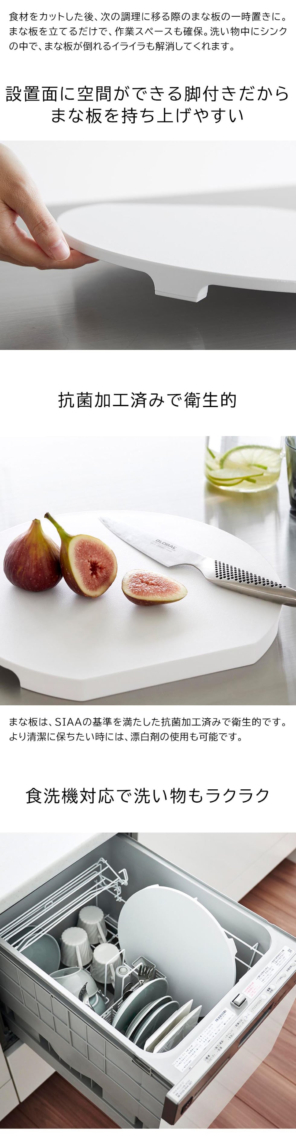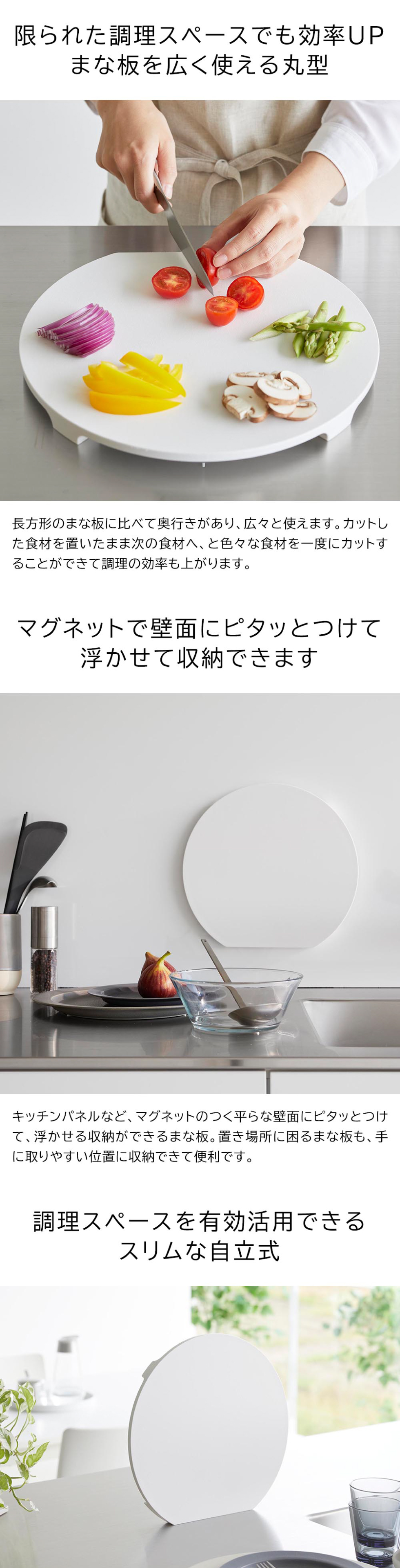 マグネットで浮かせて収納できる、食洗機対応の抗菌まな板。長方形のまな板に比べて奥行きがあるのでまな板を広く使えるラウンド型。洗った後も乾かしやすい自立式。 脚付き 調理器具
