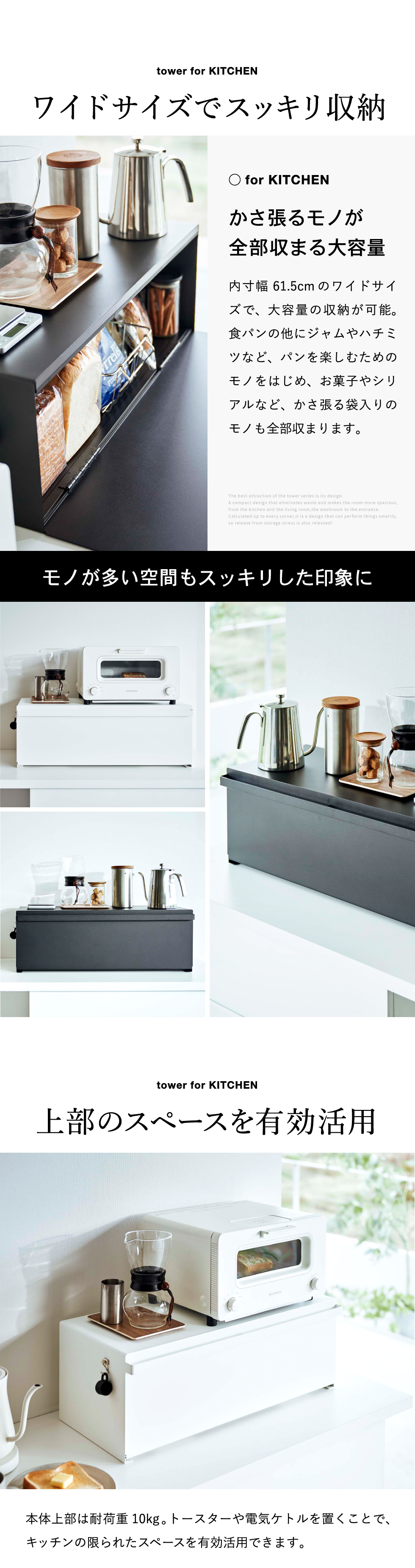 本体上部は耐荷重10kg。トースターや電気ケトルを置くことで、キッチンの限られたスペースを有効活用できます。