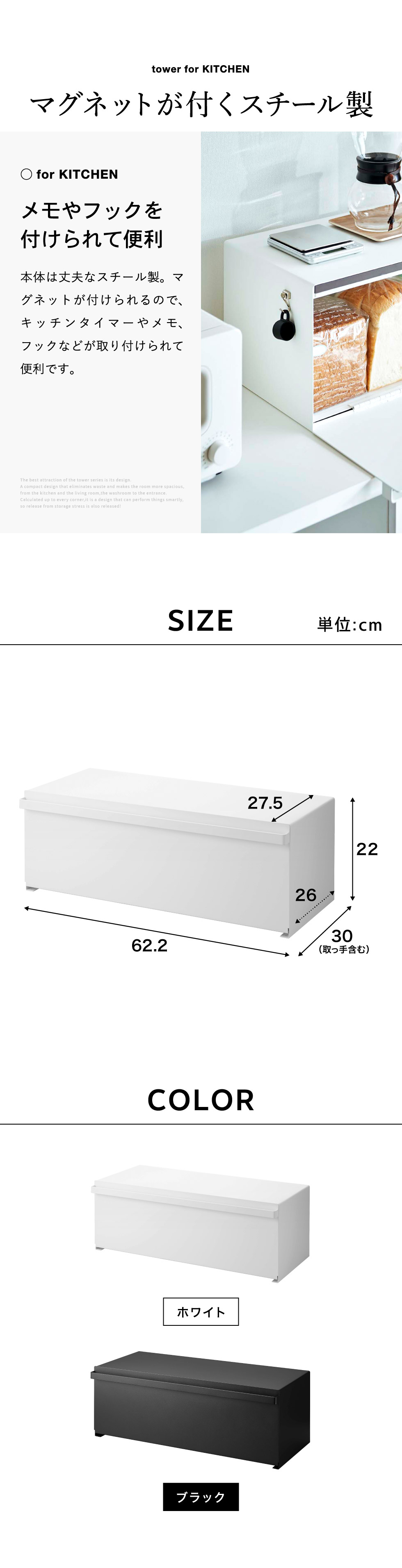 パンやお菓子が収納できる大容量のブレッドケース。幅62.2cm、奥行き26cmのワイドサイズで、一般的な食パンなら2斤まで丸ごと入ります。丈夫なスチール製で、トースターや電気ケトルなどを上に置いても◎。スッキリ収納でき、空間を有効活用できるアイテムです。※※パン1斤を約12.5cm四方で計算