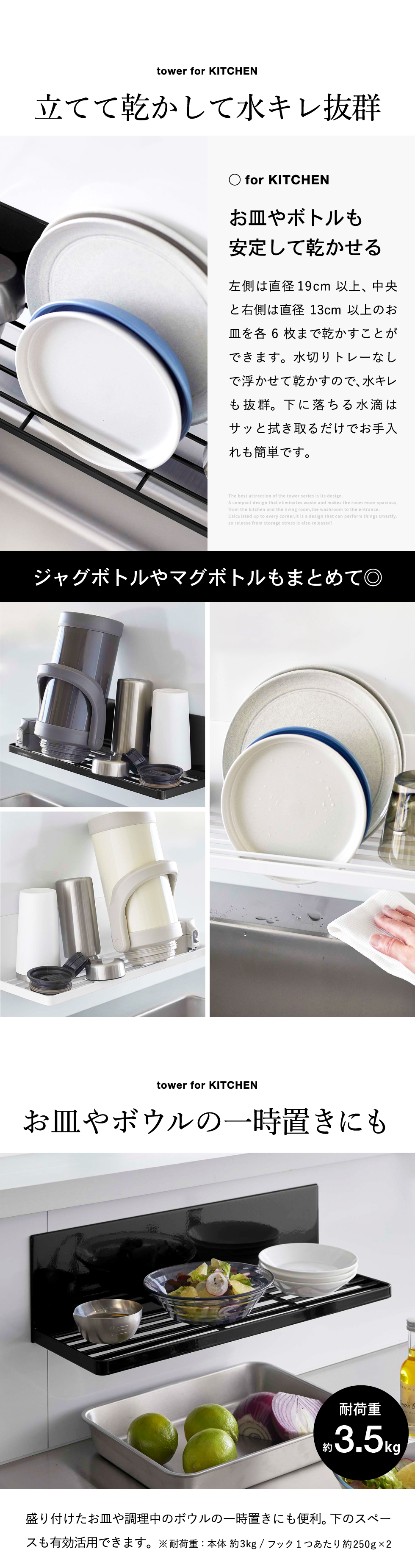 マグネットで簡単に取り付けられる水切りラック。大きいお皿も乾かせるワイドサイズで、シンク上やキッチンパネルのスペースを有効活用できます。布巾を掛けたりブラシを引っ掛けることも可能。調理中のお皿やボウルの一時置きとしても便利です。