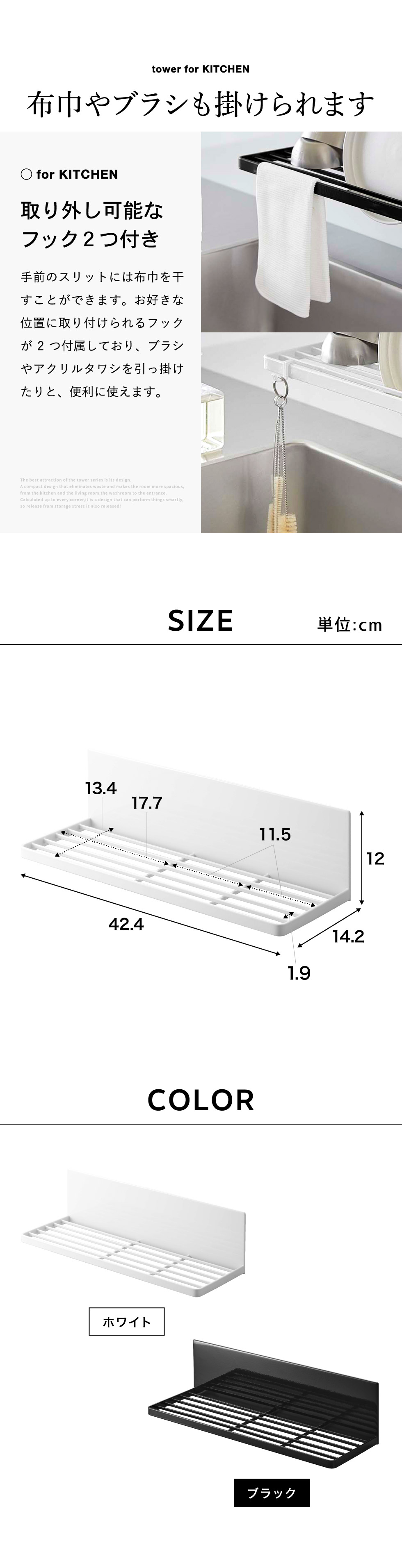 手前のスリットには布巾を干すことができます。お好きな位置に取り付けられるフックが2つ付属しており、ブラシやアクリルタワシを引っ掛けたりと、便利に使えます。