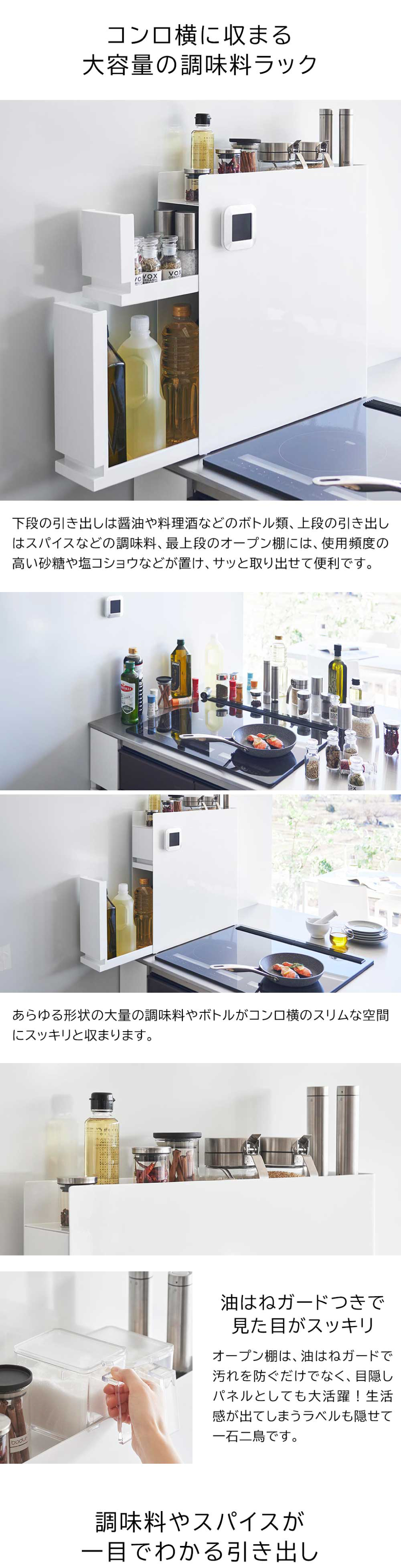下段の引き出しは、みりんや料理酒などのボトル類、上段の引き出しはスパイスなど、調味料を大容量収納できるラックです。最上段のオープン棚にも収納可能で、使用頻度の高い砂糖や塩コショウなどが置け、すぐ取り出せて便利です。