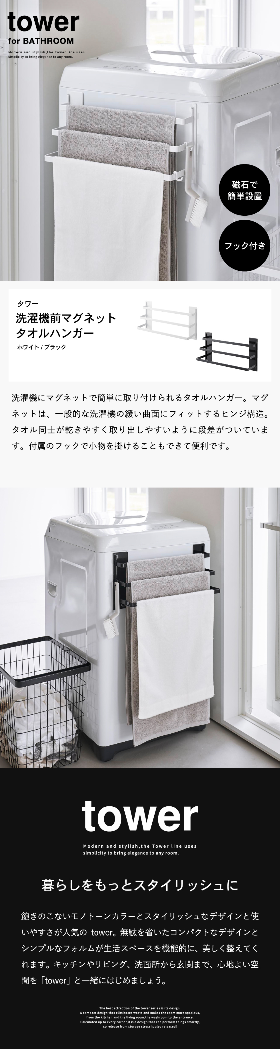 ホワイトとブラックを中心とした飽きのこないモノトーンカラーと、どんなインテリアにもスッと馴染むスタイリッシュなデザイン。そして、とことんシンプルながら、より豊かな暮らしを提案するアイデアがたくさん詰まった、使いやすいアイテムが人気です。無駄を省いたコンパクトなデザインと、シンプルなフォルムが生活スペースを機能的に、美しく整えてくれます。towerのアイテムをライン使いすれば、すっきりとした統一感が生まれ、お洒落でシックな雰囲気を演出します。キッチンやリビング、洗面所から玄関まで揃えたくなるtowerシリーズで、毎日の暮らしを彩る心地よい空間を。