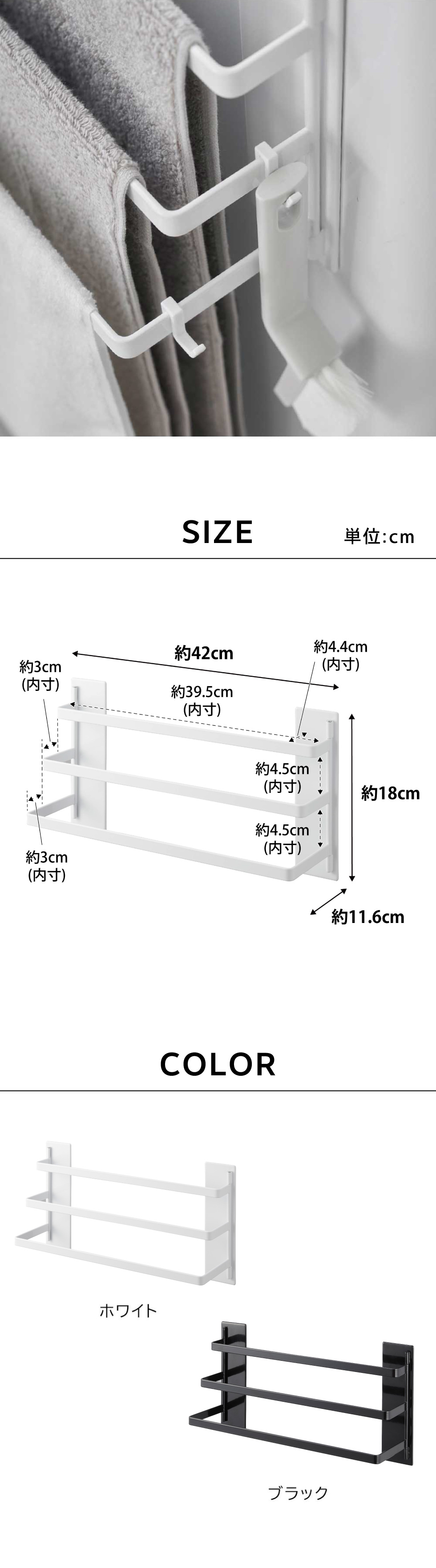 マグネット部分がヒンジ構造になっているので、洗濯機の曲面にフィットします。タオル同士が重ならないので、乾きやすく出し入れがしやすいラダー形状。付属のフックで、洗濯機周りの小物も掛けることができます。
