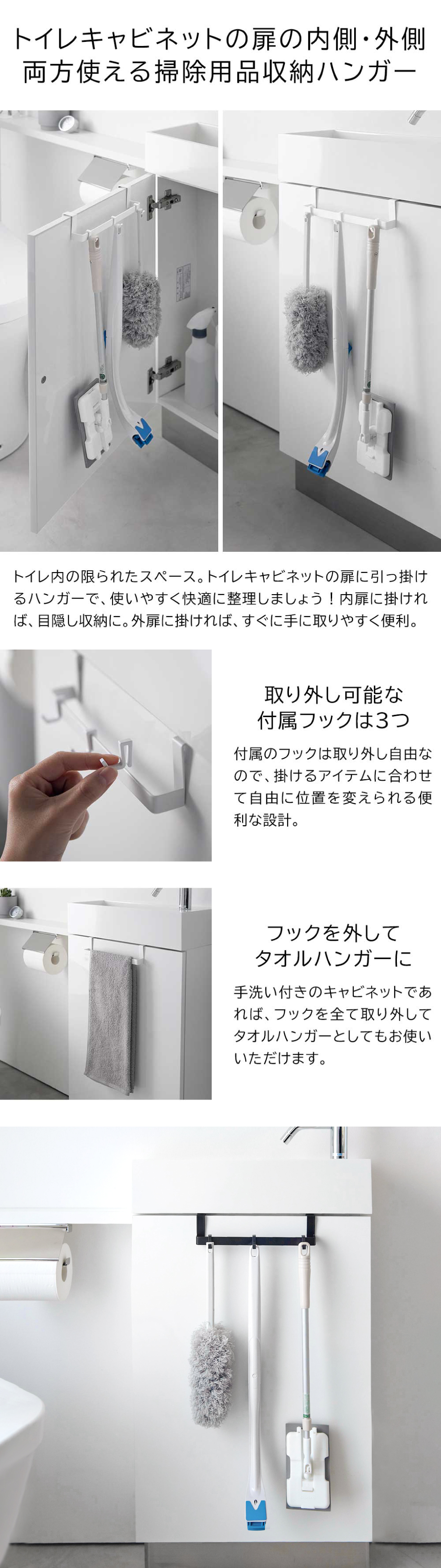 フックは取り外しできるので、掃除用具のサイズに合わせて位置を変えられて便利。手洗い付きのキャビネットであれば、フックを全て外してタオルハンガーとしても使えます。