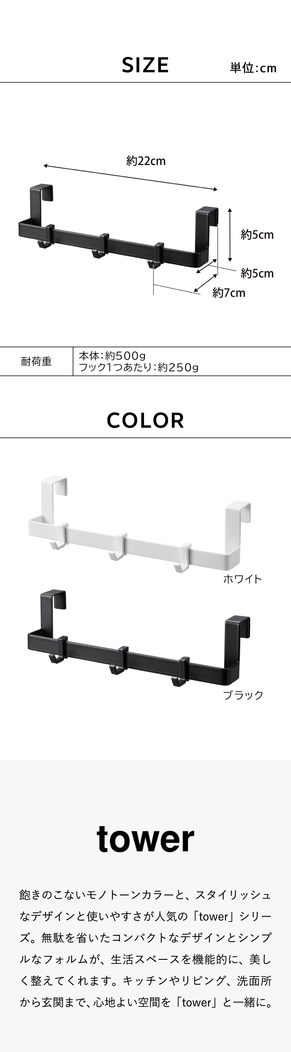 耐荷重 本体:約500g フック1つあたり:約250g |