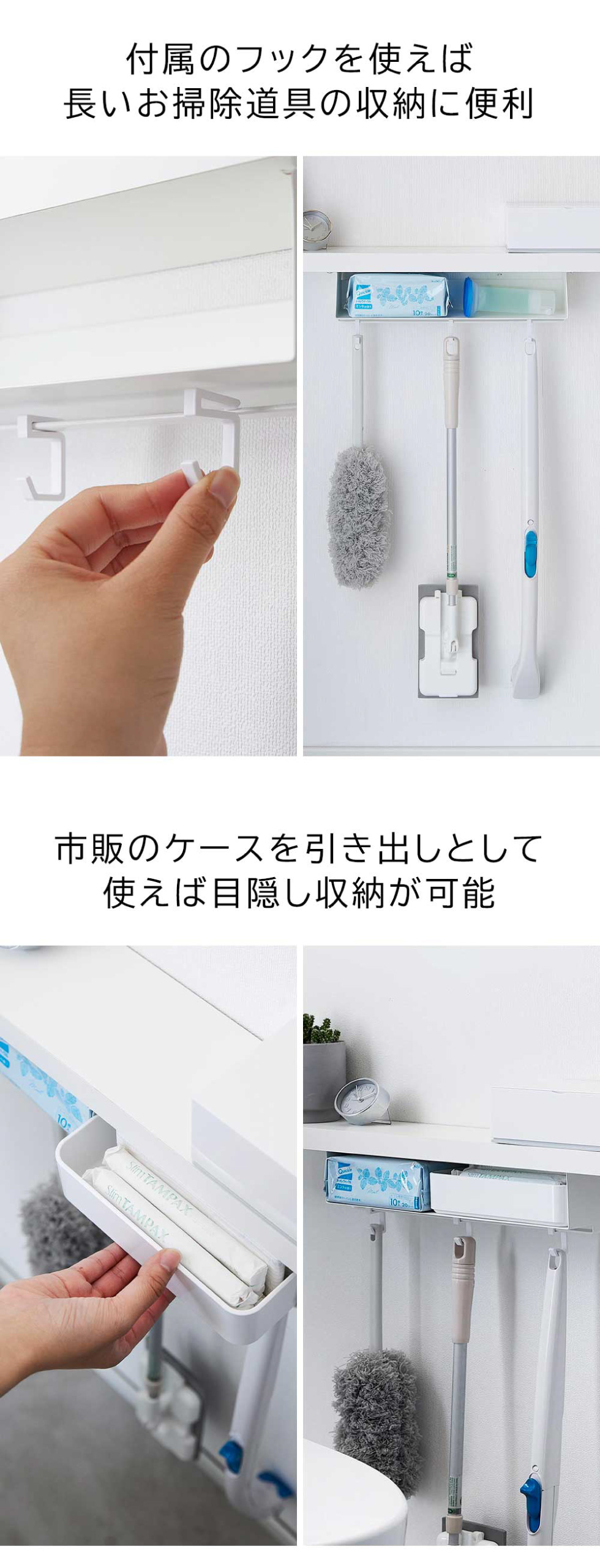 掃除用品も浮かせる収納なので衛生的に保てます。付属のフックはラック下の好みの位置に取り付けられ、便座や動線に合わせて使いやすいセッティングが可能です。