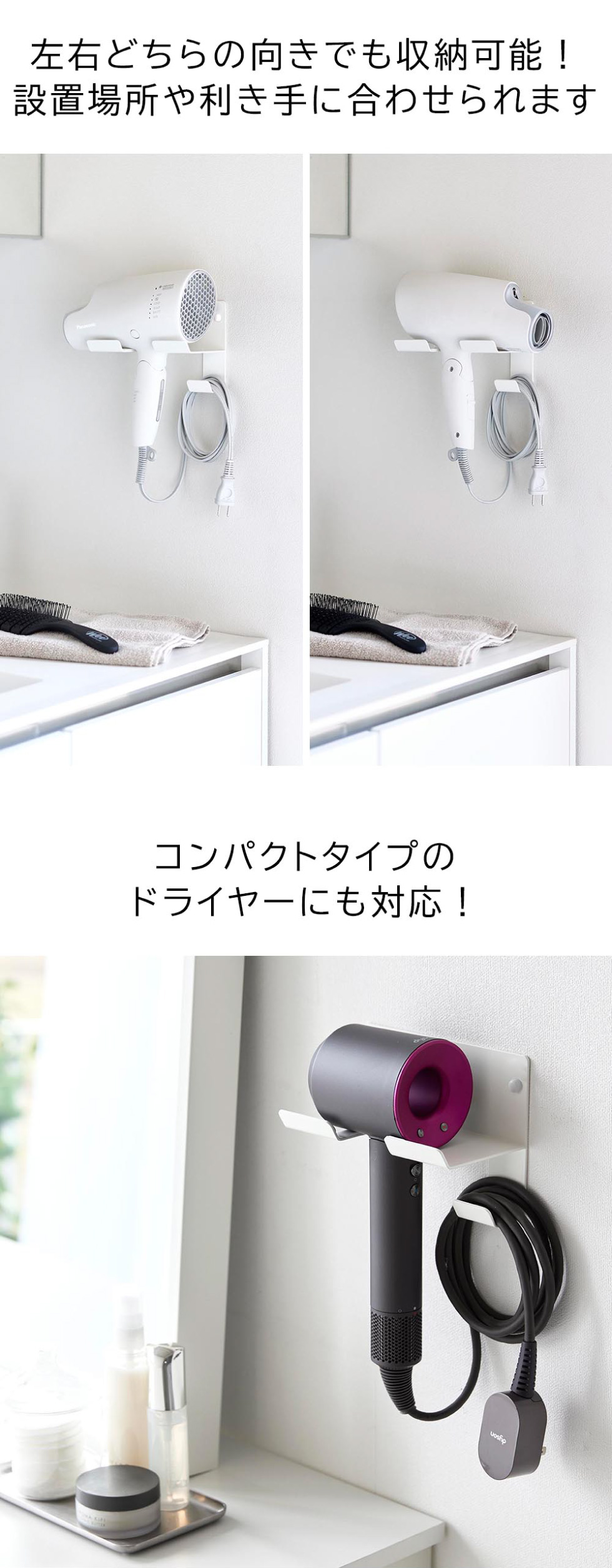 浮かせているので手に取りやすく、片手でサッと取り出してスッと片付けることができる、ストレスフリーなドライヤーの収納。壁を利用して設置できるため、限りある洗面スペースを有効活用したい方にもおすすめ。設置場所や利き手に合わせて、右向き・左向きのどちら向きでもお使いいただけます。小型のドライヤーも収納可能です。