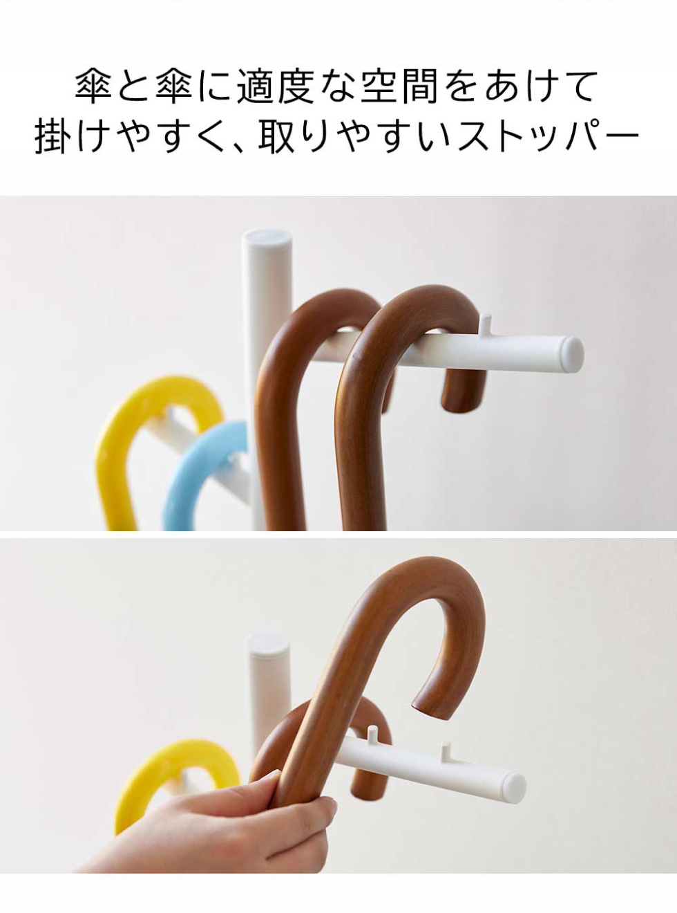 バーには突起がついており、傘同士が重ならず最大5本まで収納可能。お子様用の小さい傘や折り畳み傘、靴べらなど一箇所にスッキリ収納できます。適度に傘同士の間隔があるので、傘を取るときも掛けるときもストレスなく使いやすく、風通しが良いのも嬉しいポイント。底面は30cm×20cmと省スペース設計で、限られた玄関スペースでも場所を取らないスリムなデザインです。