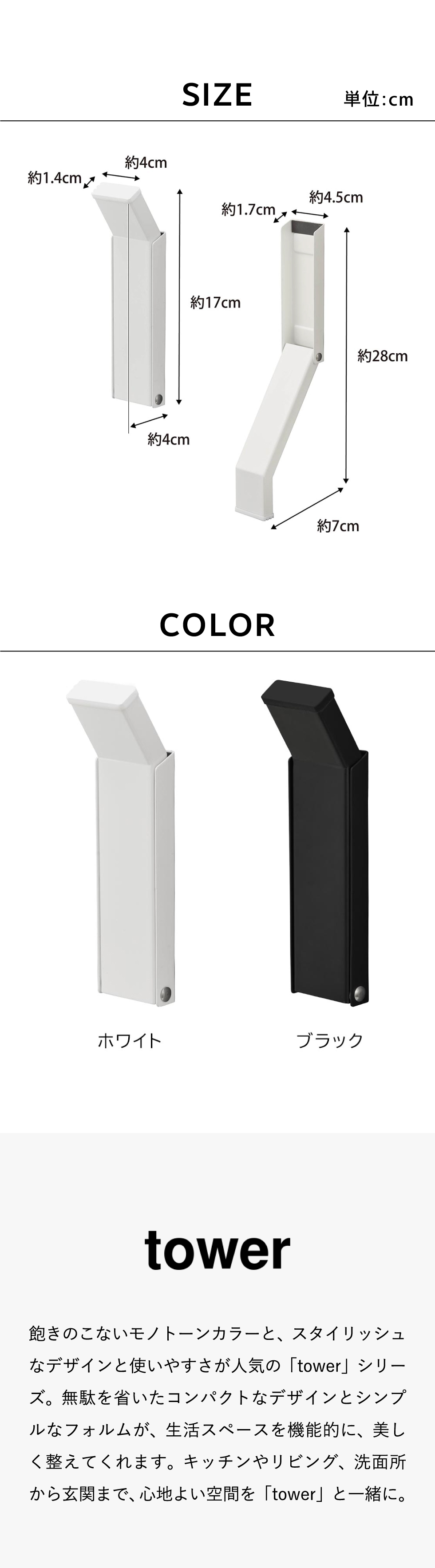 ホワイトとブラックを中心とした飽きのこないモノトーンカラーと、どんなインテリアにもスッと馴染むスタイリッシュなデザイン。そして、とことんシンプルながら、より豊かな暮らしを提案するアイデアがたくさん詰まった、使いやすいアイテムが人気です。無駄を省いたコンパクトなデザインと、シンプルなフォルムが生活スペースを機能的に、美しく整えてくれます。towerのアイテムをライン使いすれば、すっきりとした統一感が生まれ、お洒落でシックな雰囲気を演出します。キッチンやリビング、洗面所から玄関まで揃えたくなるtowerシリーズで、毎日の暮らしを彩る心地よい空間を。