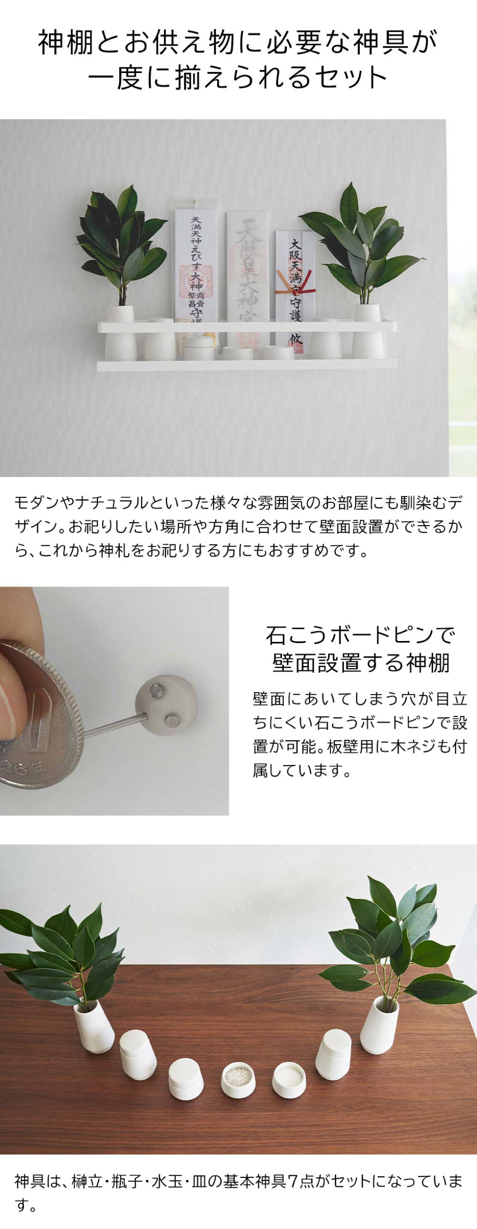 和室がなくても、洋室の部屋の壁面に簡単に設置できる神棚と神具のセットです。神棚はスチール素材で、どんな部屋の雰囲気にも合いやすいシンプルでスタイリッシュなデザイン。手前にはガードがあり、神具の落下を防げます。神札を立てやすい仕切り付きで、破魔矢を置くのにも便利。神具は上品な雰囲気の陶器製で、お供え物に必要な神具7点を一度に揃えられます。