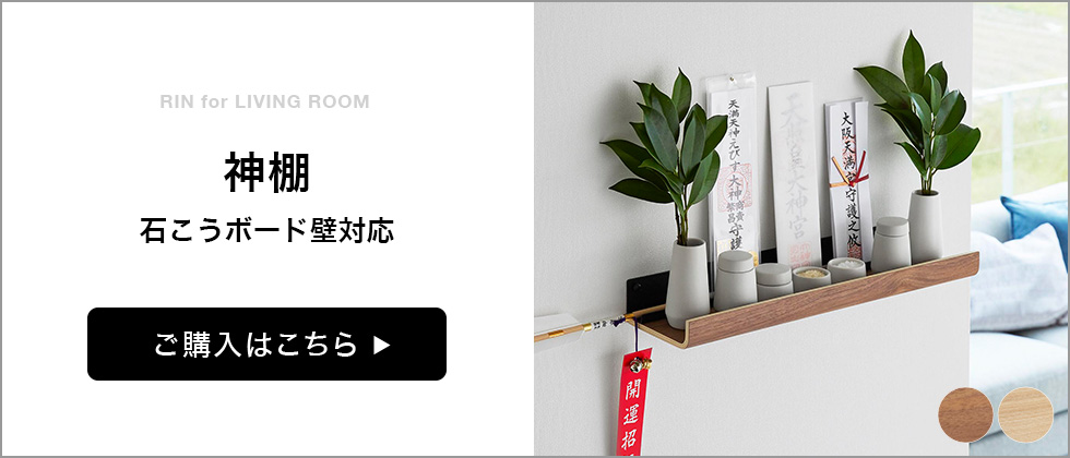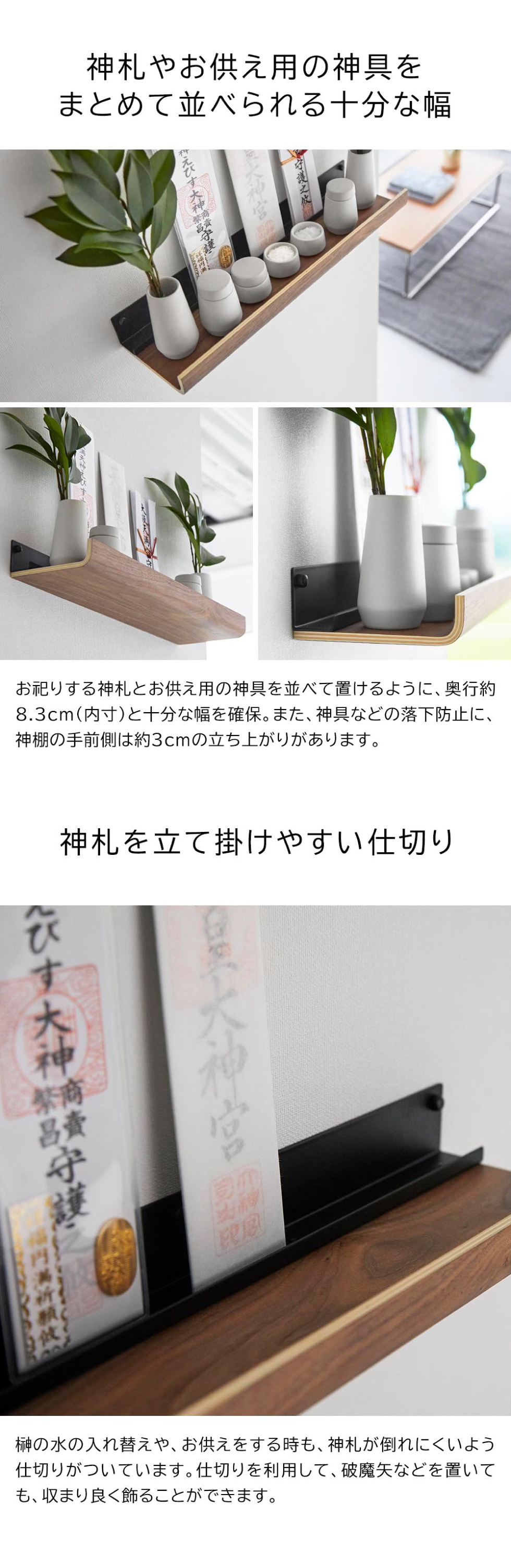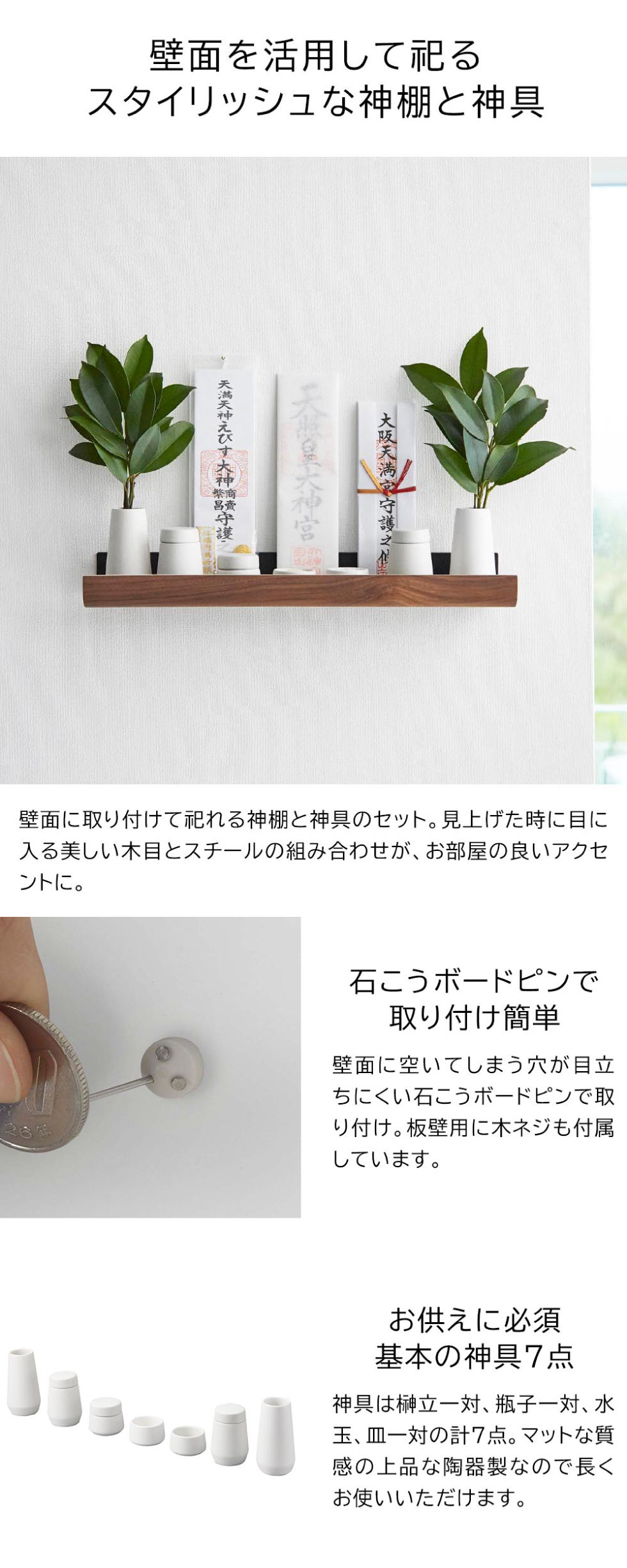 壁の穴が目立ちにくい石こうボード用ピンで簡単取り付け。美しい木目とスタイリッシュなスチールの組み合わせがお部屋になじむシンプルな神棚と神具7点セット。