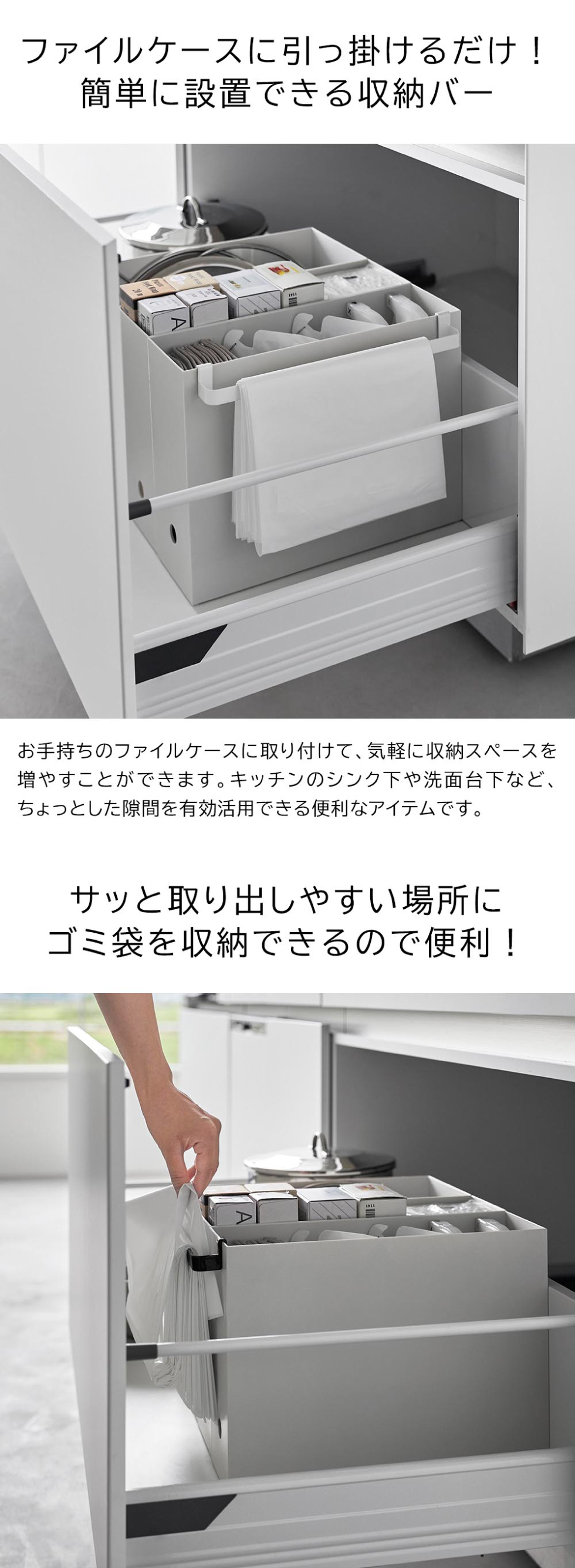 ファイルケースに引っ掛けるだけで簡単に設置できる引っ掛け収納バー。ちょっとした隙間を有効活用できる便利アイテム! シンプル おしゃれ