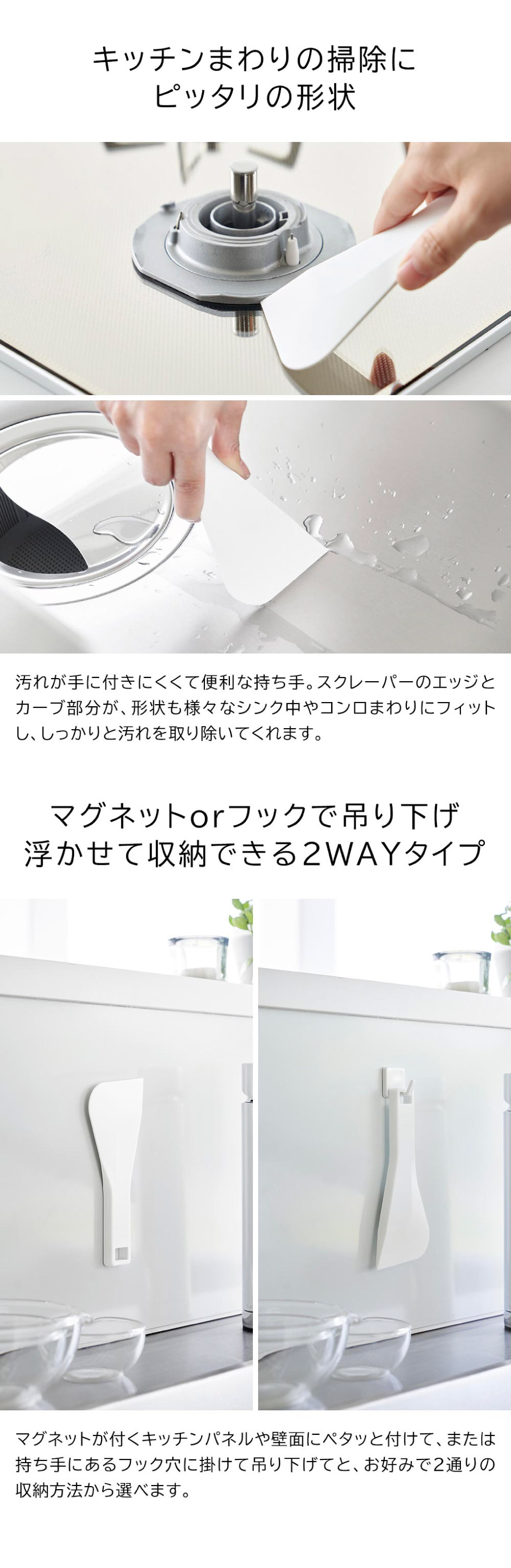 食器や調理器具の予洗いや、コンロまわり・シンクまわりのお掃除に。シリコーン製のスクレイパーで便利。壁面パネルに浮かせて収納可能。 洗い物 予洗い 壁掛け yamazaki