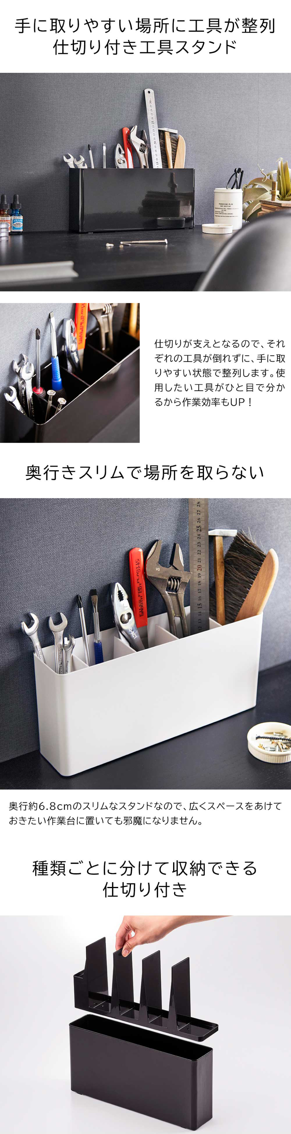 スタンドの中には仕切り板がセットされており、5つの枠に分けられています。右3枚の仕切り板の奥にはスリットが入っているので、紙やすりのような薄くて幅広のアイテムも収納できます。立てて入れるので、どの工具がどこにあるか一目瞭然で、使いたい時にサッと取り出せて便利です。