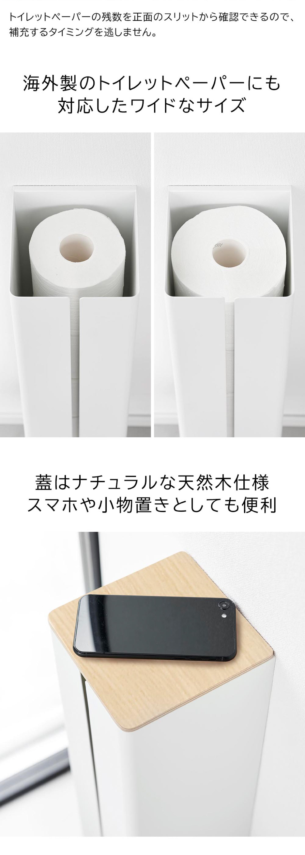 生活感の出るトイレットペーパーを隠し収納するホルダー。石こうボードピンや木ネジを使って壁面に設置可能。直置きも可能。残量が一目で分かる便利なスリット付き。 yamazaki