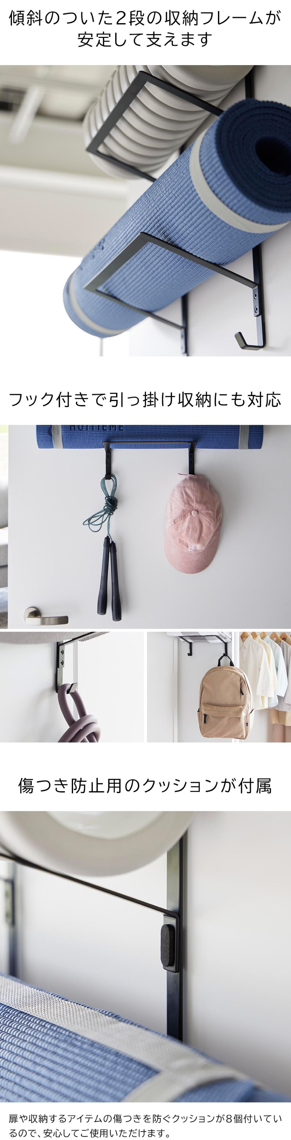 ドアやクローゼット扉に引っ掛けるだけで設置できるトレーニンググッズの収納ハンガーです。2段の収納部分には傾斜がついており、ヨガマットやフォームローラーなど丸いものを収納しても落ちにくい設計。フックには、縄跳びやトレーニングチューブ、キャップやリュックなどの引っ掛け収納も可能です。