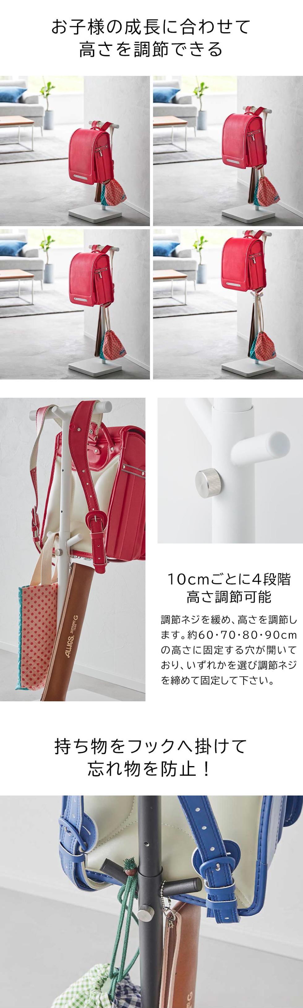 お子様の成長に合わせて、10cmごとに4段階で高さが調節できるスタンド。ランドセルを掛けた状態で開け閉めでき、教科書やノートを取り出せるので、ランドセルを片付けた後、そのまま宿題へと動作がスムーズ。台には水筒や小物を置くことができ、学校へ持っていくモノが一箇所にまとまります。