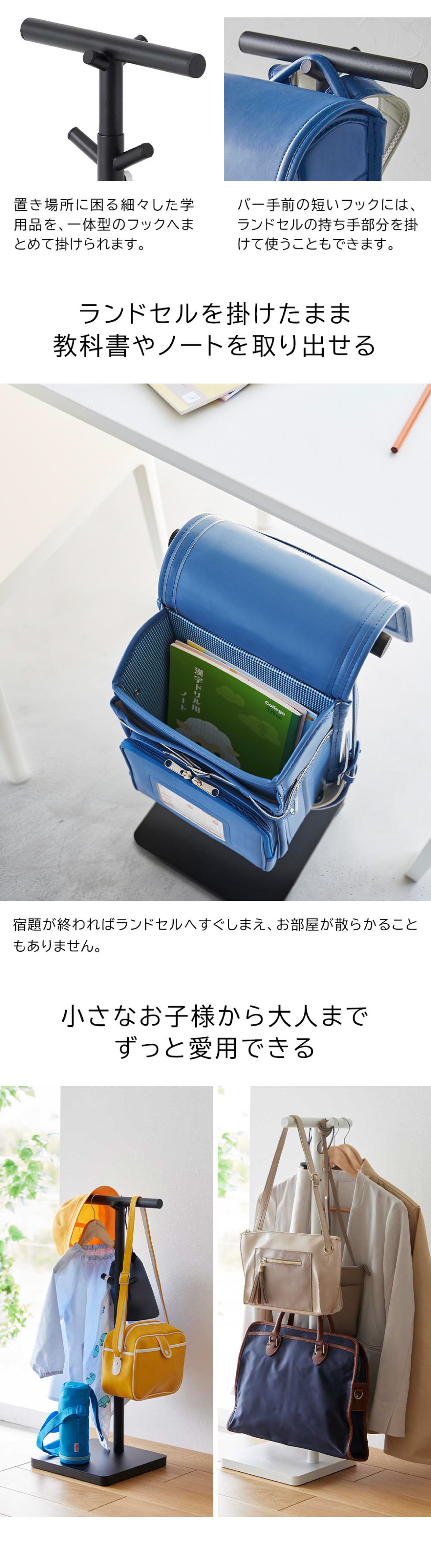 ランドセルを掛けるだけでなく、未就学のお子様の通園バッグや帽子掛けにも便利。卒業してからは中高生の通学鞄やシューズバッグ、塾や習い事のリュック、社会人になってからは通勤バッグや洋服掛けなど長くご利用いただけます。土台は26cm四方と場所をとらないので、玄関周りやリビングの片隅、部屋のドア近くなど、その時々で使いやすい場所に省スペースで置くことができます。