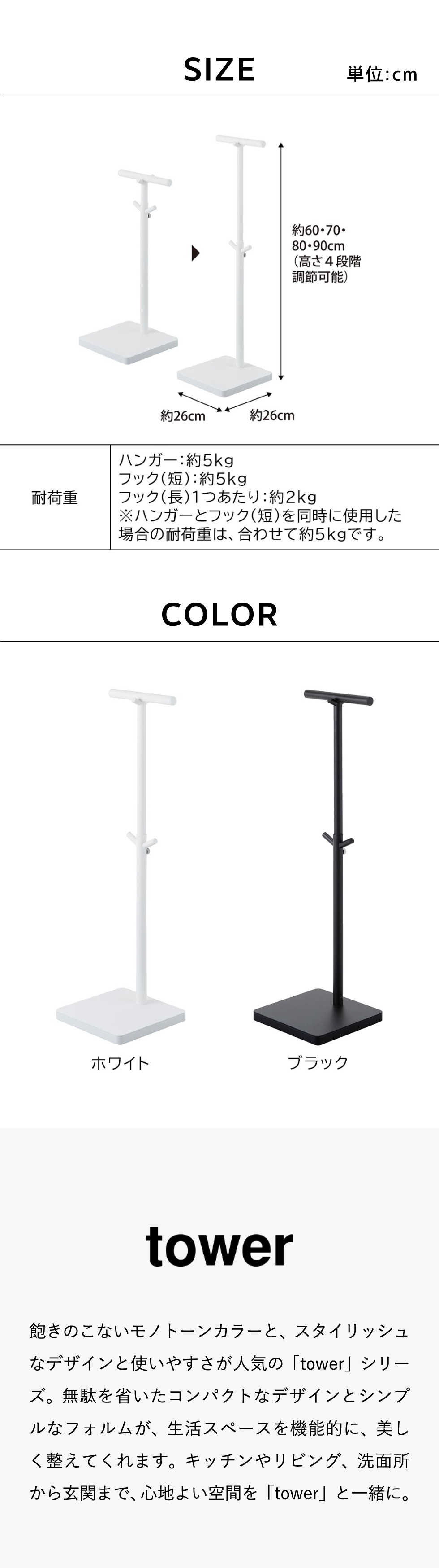 耐荷重 ハンガー:約5kg フック(短):約5kg フック(長)1つあたり:約2kg ※ハンガーとフック(短)を同時に使用した場合の耐荷重は、合わせて約5kgです。(例:ハンガーで約4kg分使用時は、フック短は約1kgまで使用可) |