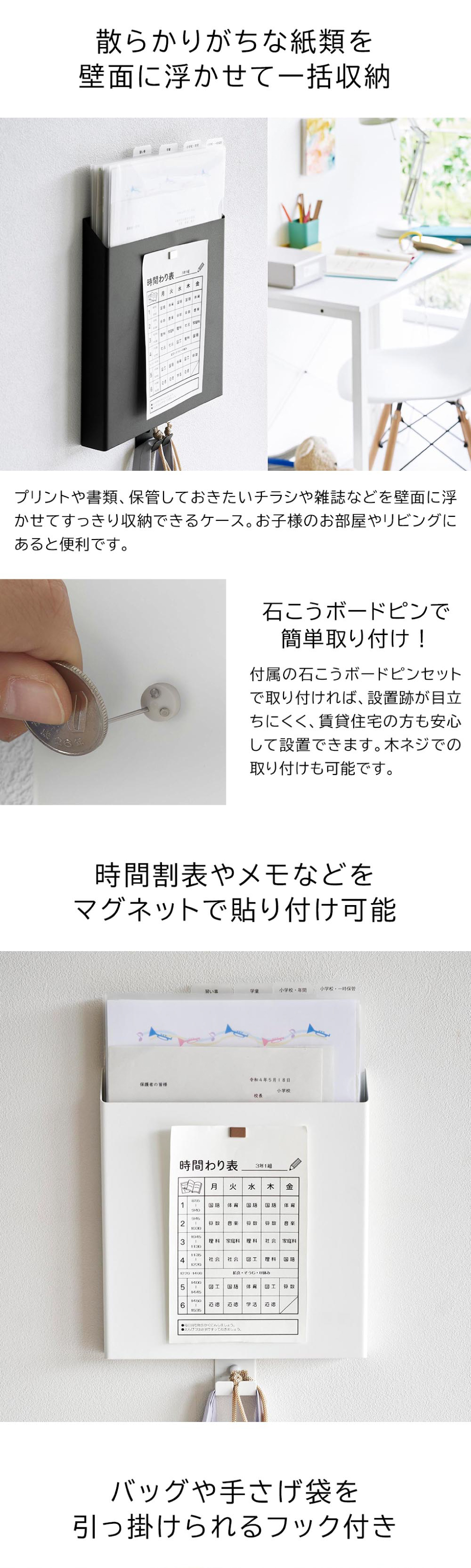 石こうボードピンで簡単取り付け!プリント類や手さげ袋などを壁面に浮かせて一括収納できる収納ホルダー 学校の時間割表やメモなどをマグネット貼付可能なスチール製 壁面収納