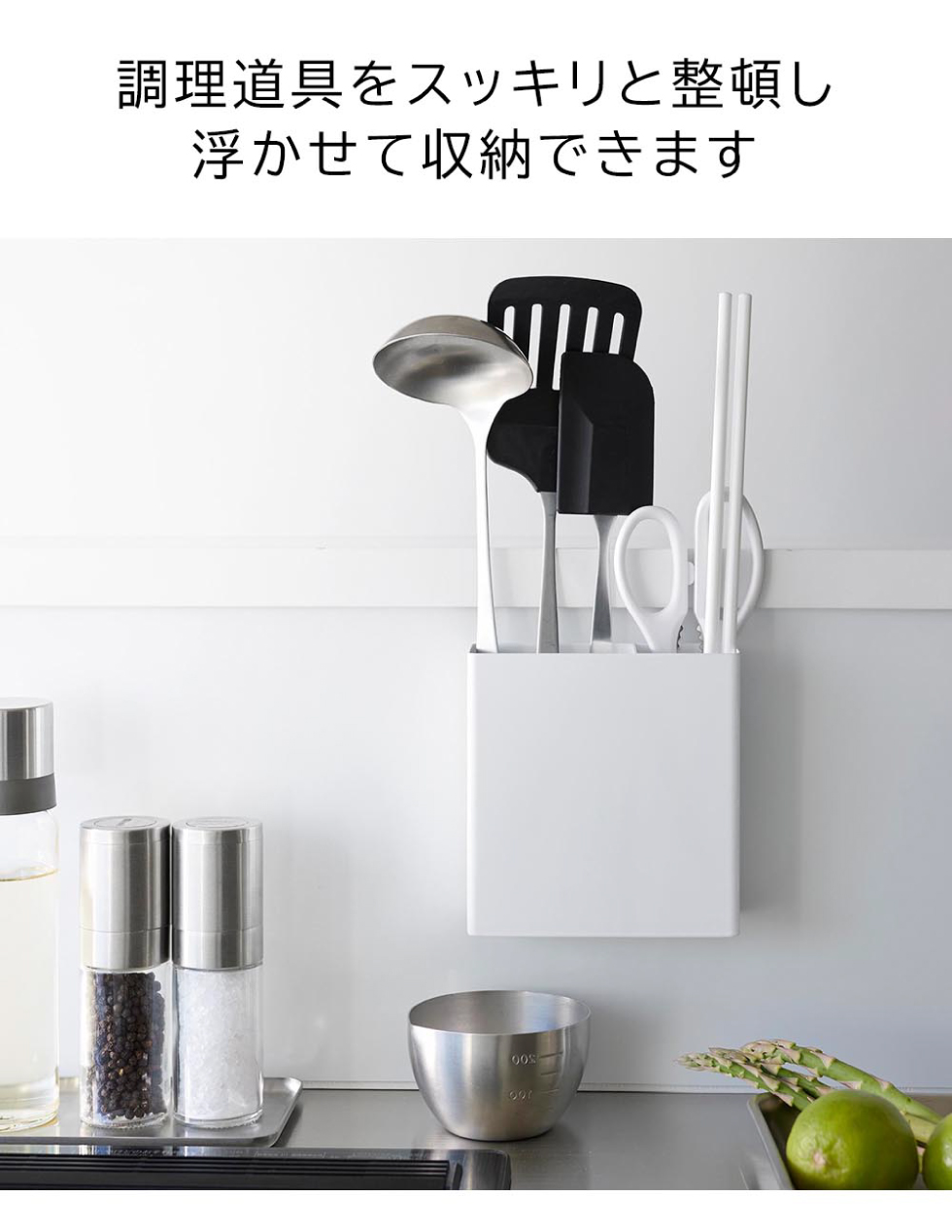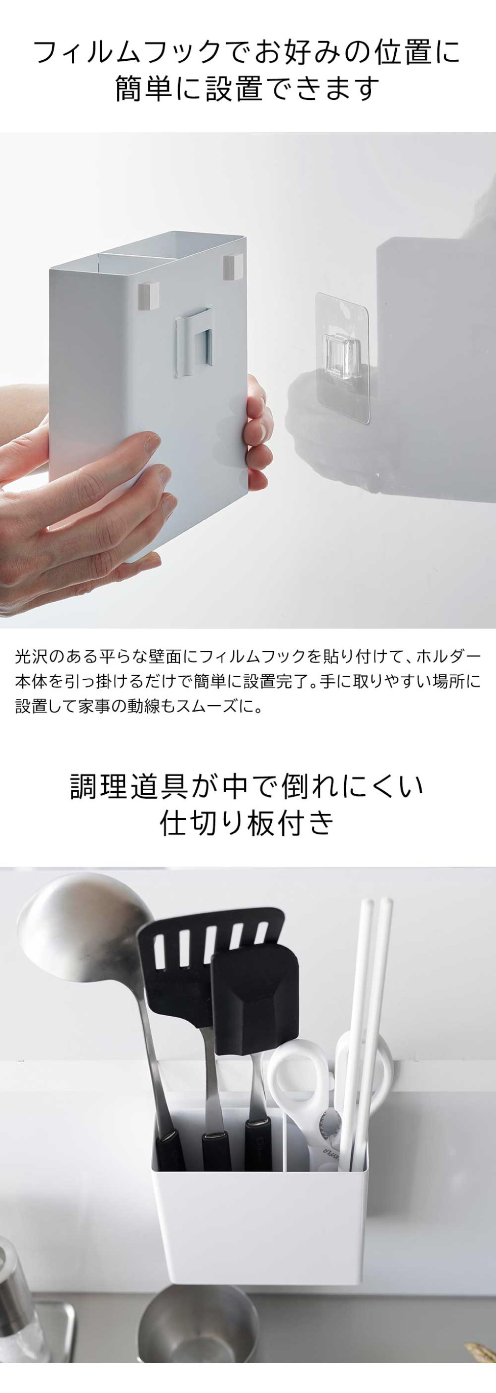 調理道具をスッキリと立てて整頓。浮かせて収納できるキッチンツールホルダー。キッチンパネルやタイルなどのお好みの位置にフィルムフックでペタッと貼り付けて設置も簡単です。