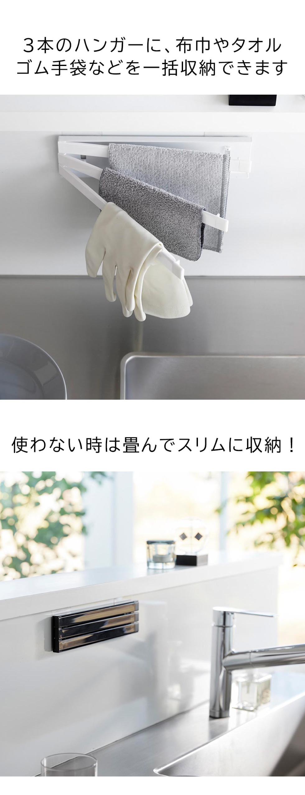 布巾以外に、普段よく使うゴム手袋やタオルなども同時に収納できて便利です。使用時は、ハンガーを広げて手に取りやすいだけでなく、掛けているモノが乾きやすく衛生的。使わない時はハンガーを畳んでスリムに収納できるので、見た目もスッキリです。