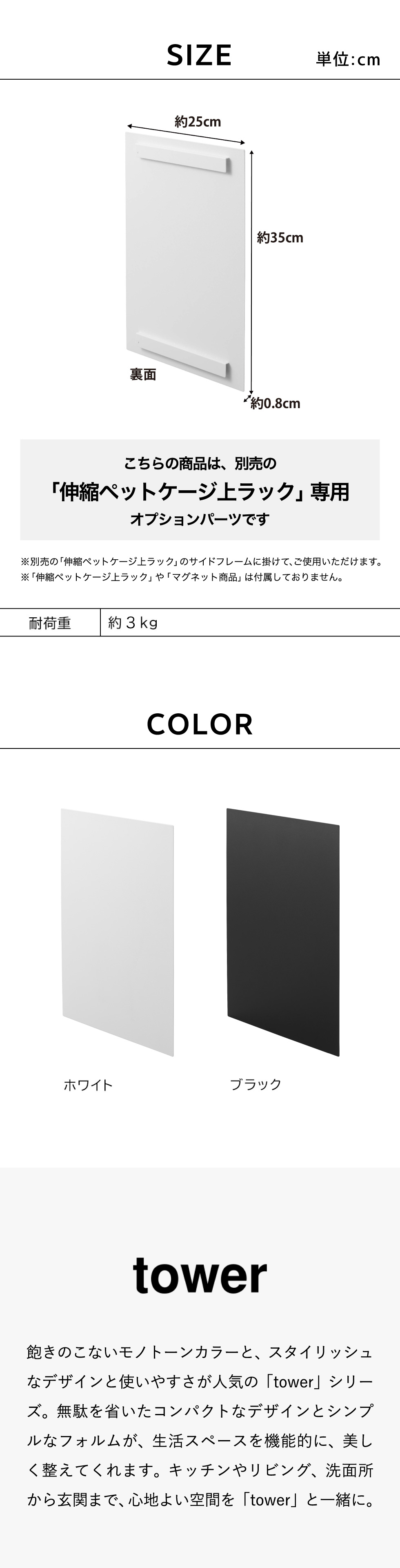 ペットケージ上のデッドスペースを有効活用できる「伸縮ペットケージ上ラック タワー(別売)」専用のオプションパーツ。マグネット小物が付けられるようになるスチールパネル!