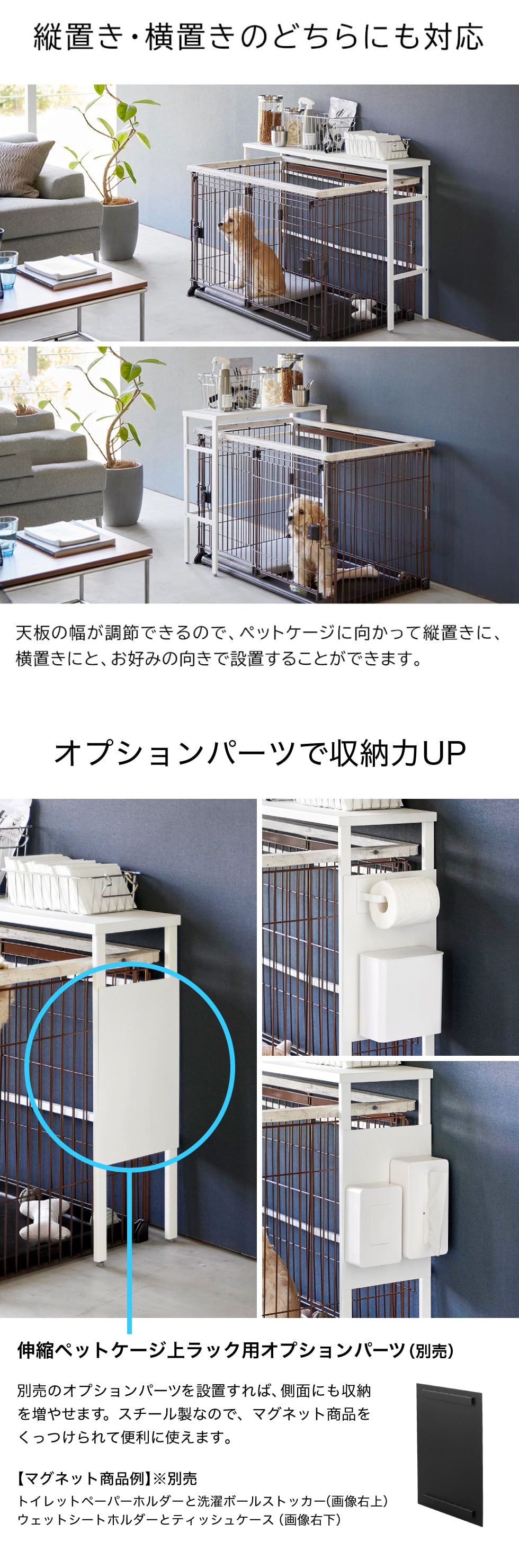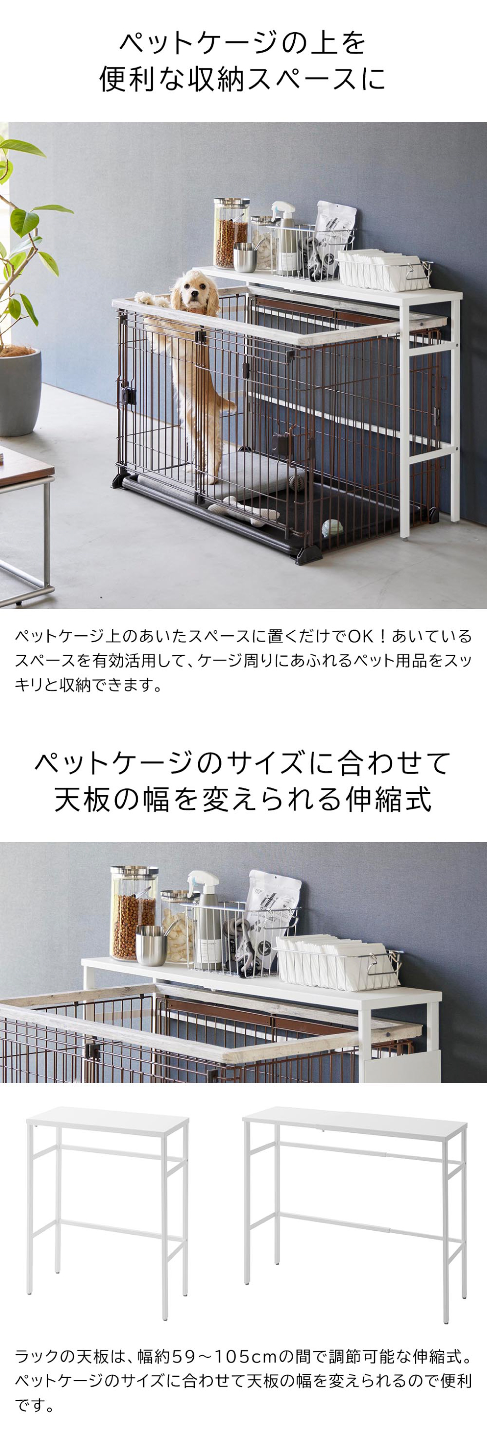 ペットケージ上のあいてるスペースを有効活用!ゴチャつくペット用品をスッキリ収納できるペットケージ上ラックです。ペットケージに合わせて天板の幅を変えられる便利な伸縮式。