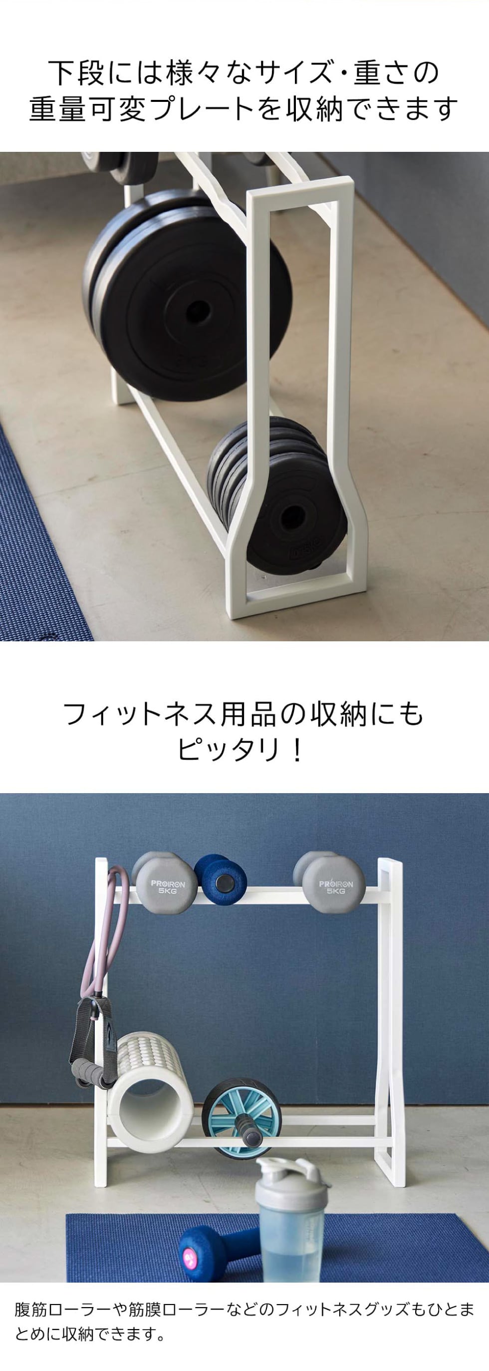 ダンベルや重量可変プレートの他にも、腹筋ローラーやフォームローラーなどのフィットネスグッズの収納にもオススメ。置き場所に困る形状や重さの違うグッズも一括収納できて便利です。フレームのみなので、収納する時も使う時も手に取りやすい構造です。