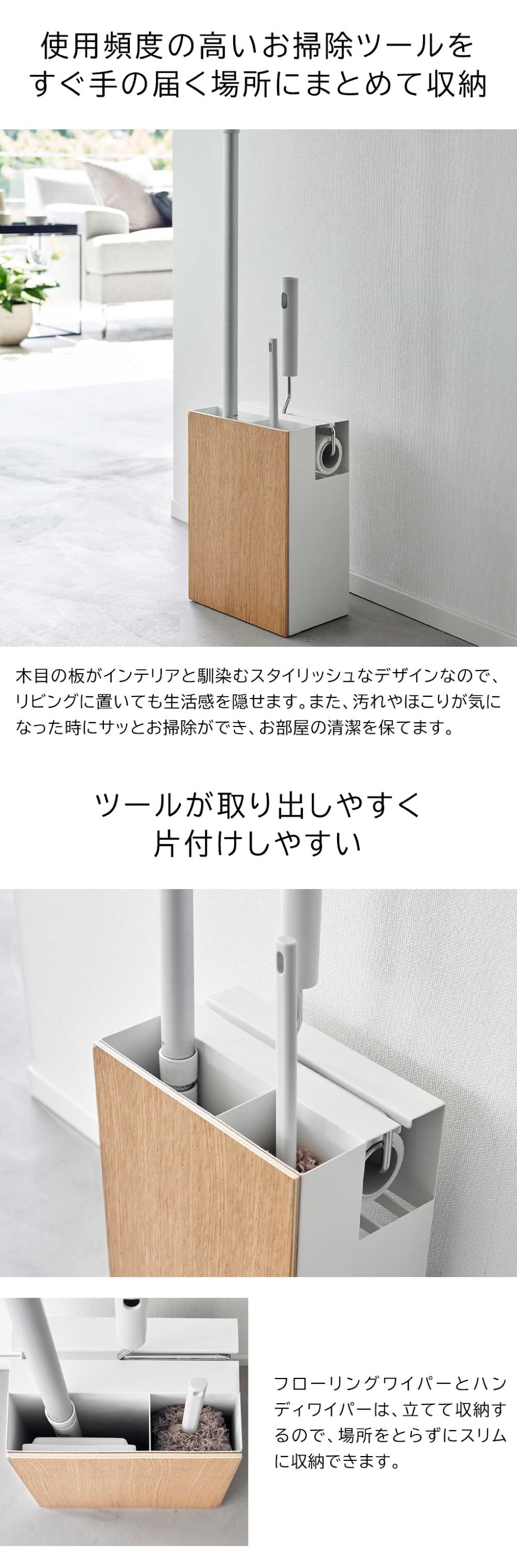 フローリングワイパー・ハンディワイパー・カーペットクリーナーを隠して一括収納。背面にスペアを収納可能。木目の板がおしゃれで、リビングにも置けるスタイリッシュなデザイン。