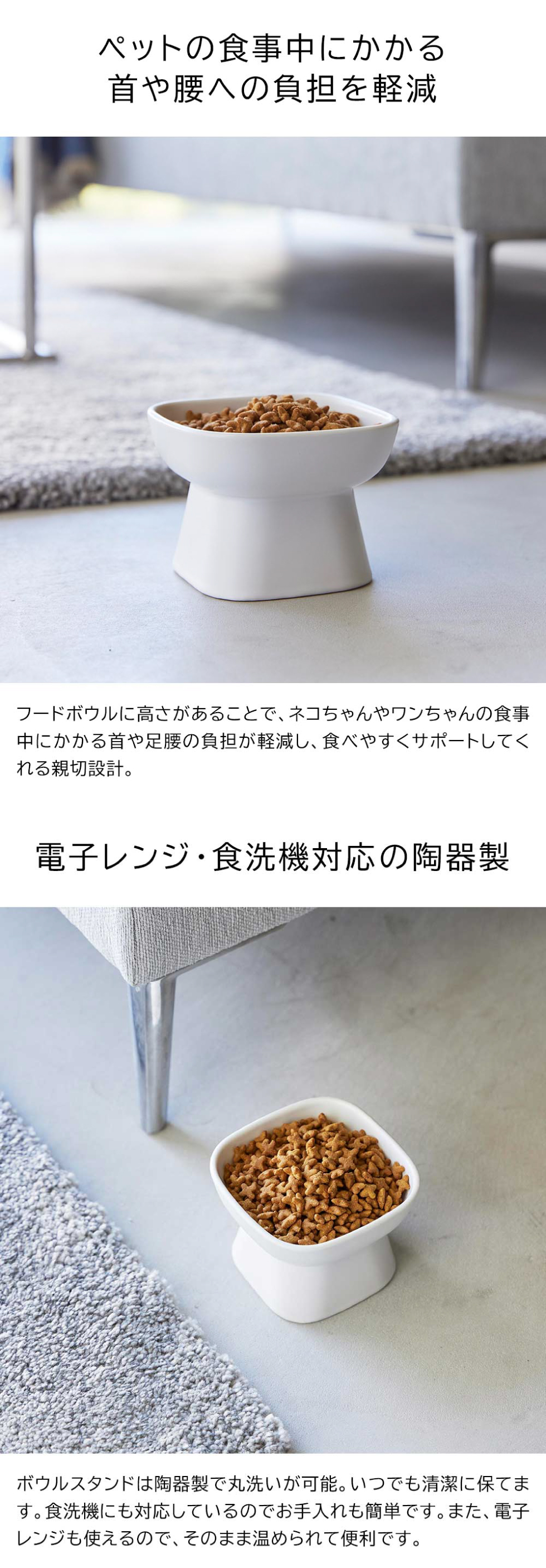 大切なペットの食事中の体勢をサポートしてくれる、食べやすい高さのフードボウルです。高さがあることで食事中の首や足腰の負担を軽減。複数使いで、ご飯・ウェットフードなどのお食事用と飲み水用など、用途で分けても◎。インテリアになじむシンプルでスタイリッシュなデザインも魅力です。