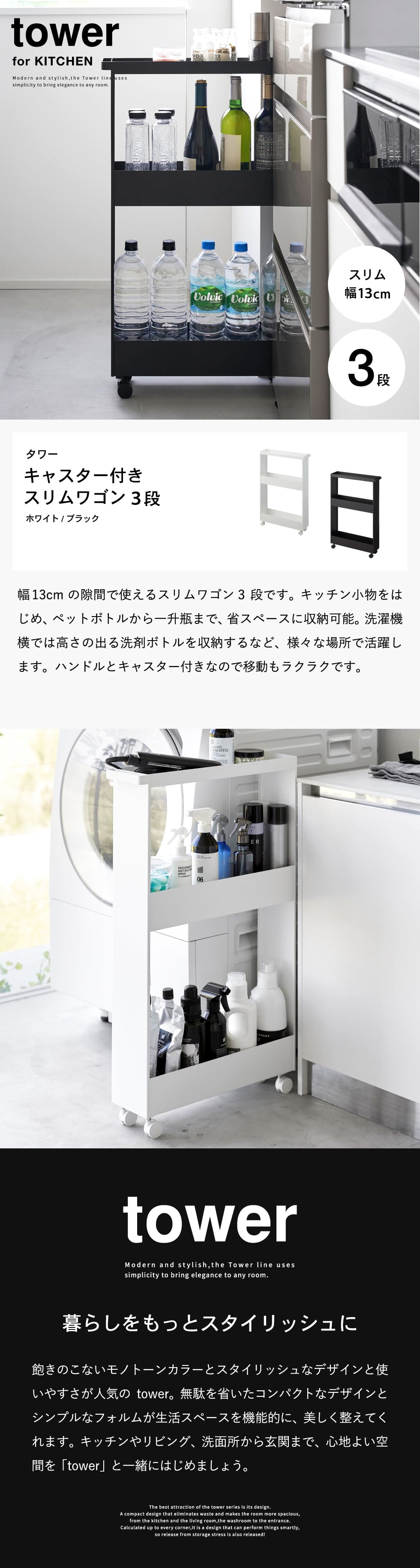 ホワイトとブラックを中心とした飽きのこないモノトーンカラーと、どんなインテリアにもスッと馴染むスタイリッシュなデザイン。そして、とことんシンプルながら、より豊かな暮らしを提案するアイデアがたくさん詰まった、使いやすいアイテムが人気です。無駄を省いたコンパクトなデザインと、シンプルなフォルムが生活スペースを機能的に、美しく整えてくれます。towerのアイテムをライン使いすれば、すっきりとした統一感が生まれ、お洒落でシックな雰囲気を演出します。キッチンやリビング、洗面所から玄関まで揃えたくなるtowerシリーズで、毎日の暮らしを彩る心地よい空間を。