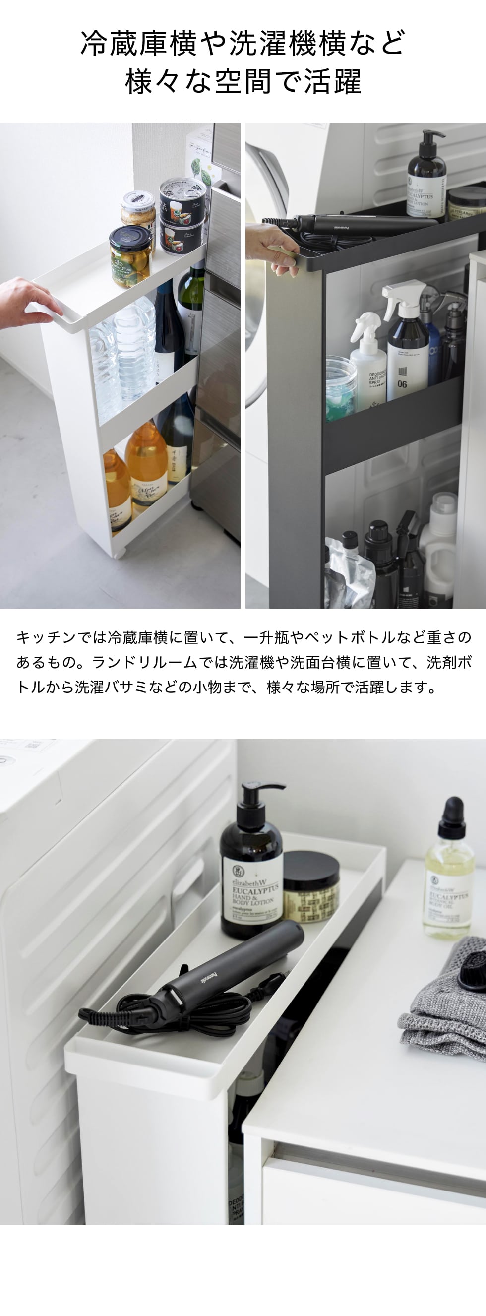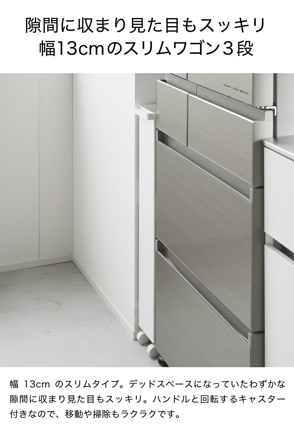 幅13cmの隙間で使えるハンドル付きのスリムワゴン3段です。隙間に収まり見た目もスッキリ。ハンドルや回転するキャスター付きなので移動や掃除もラクラク。キッチンでは、キッチン小物から置き場所に困る一升瓶やペットボトルなどの重い物まで、冷蔵庫横やキッチン横などの省スペースに収納できます。ランドリルームでは、掃除道具や高さのある洗濯洗剤のボトル、洗濯バサミなどの小物まで、洗濯機や洗面台横の隙間に収納できます。