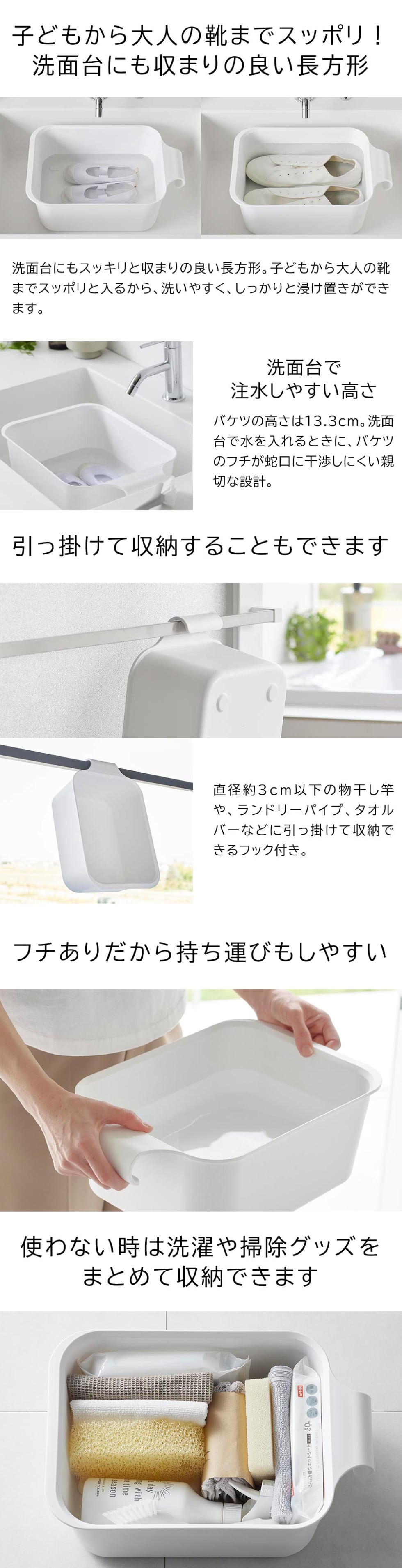 衣類や布巾を始め、子供から大人のシューズまで、しっかり浸け置きして洗える長方形。高さ13.3cmの浅型タイプで、洗面台では蛇口に干渉せず水を溜められます。内側には6Lまで1Lごとにメモリが付いており、浸け置き洗いの際の計量がしやすくなっています。水抜き栓があり、底から排水することができて便利です。