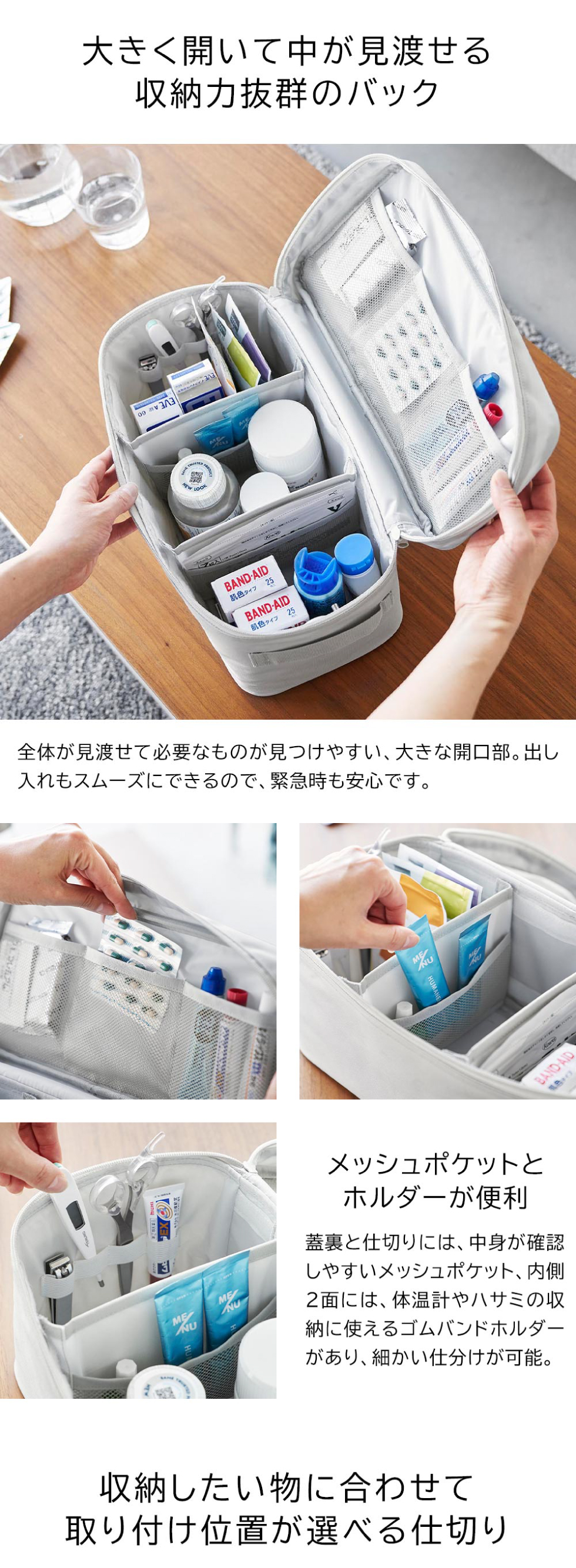 仕切りとポケットで細かく仕分けができる、収納力抜群の救急バッグです。蓋の裏のメッシュポケットには薬、左右にある8つのゴムバンドホルダーには体温計やチューブなど。怪我をした時の絆創膏からガーゼなどの衛生用品、急な発熱や痛みに備えた常備薬まで、細かく分けて収納可能です。