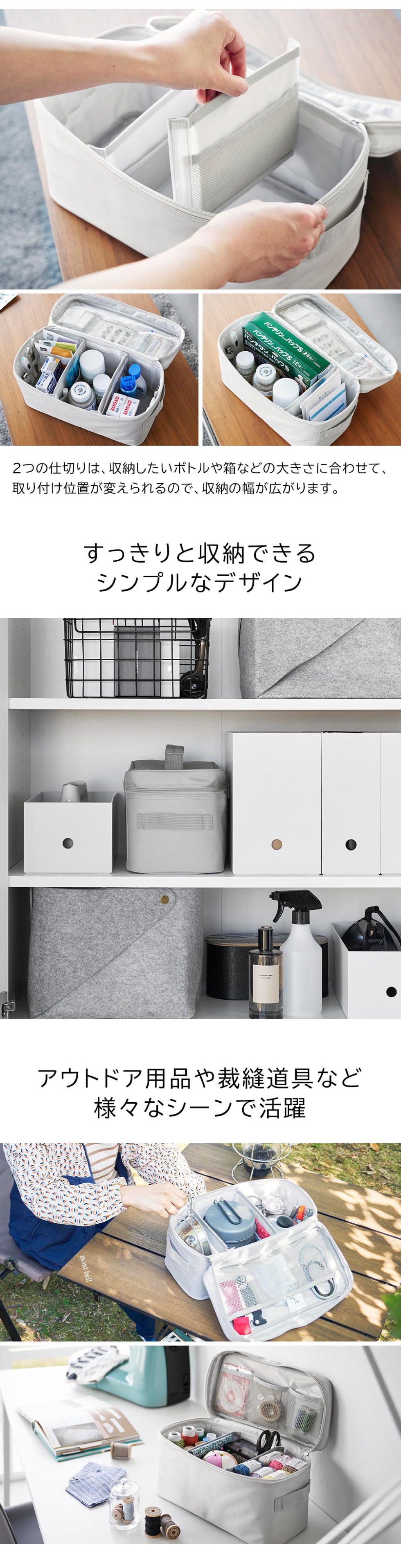 ポケット付きの可動式仕切りが2個付いているので、入れるモノに合わせて幅を変えられて便利です。開口部が大きく、パッと全体を見渡せるので、必要な時すぐある場所が分かって探す手間が省けます。アウトドア用品や裁縫道具の収納、工具入れにもオススメです。