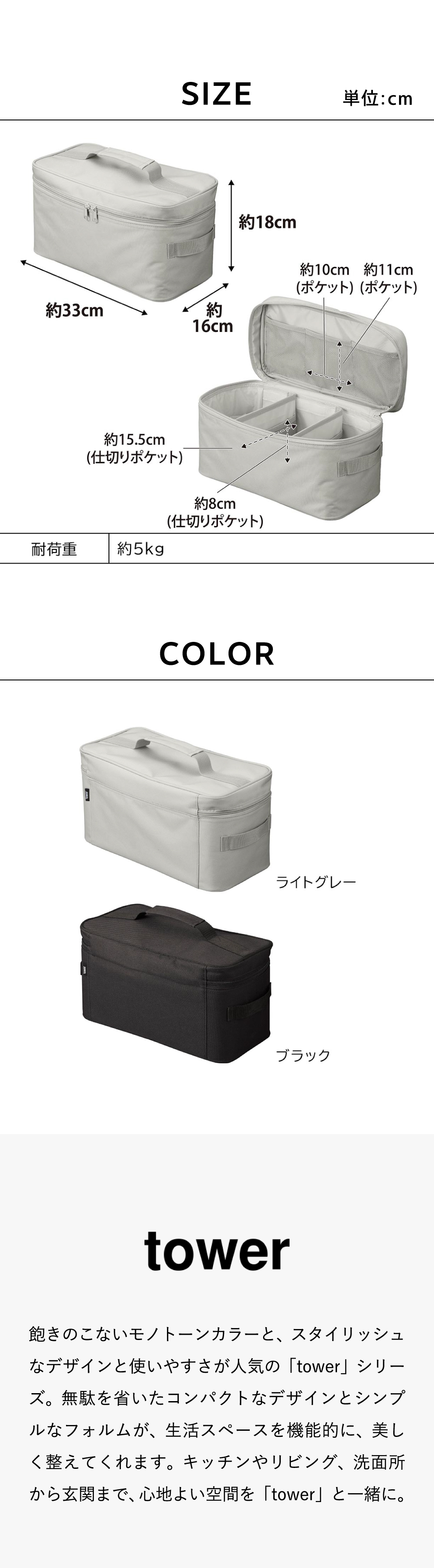 商品サイズ 本体:約W33×D16×H18cm(持ち手含まず) 仕切り:約W16×H13cm(面ファスナー部含まず) |