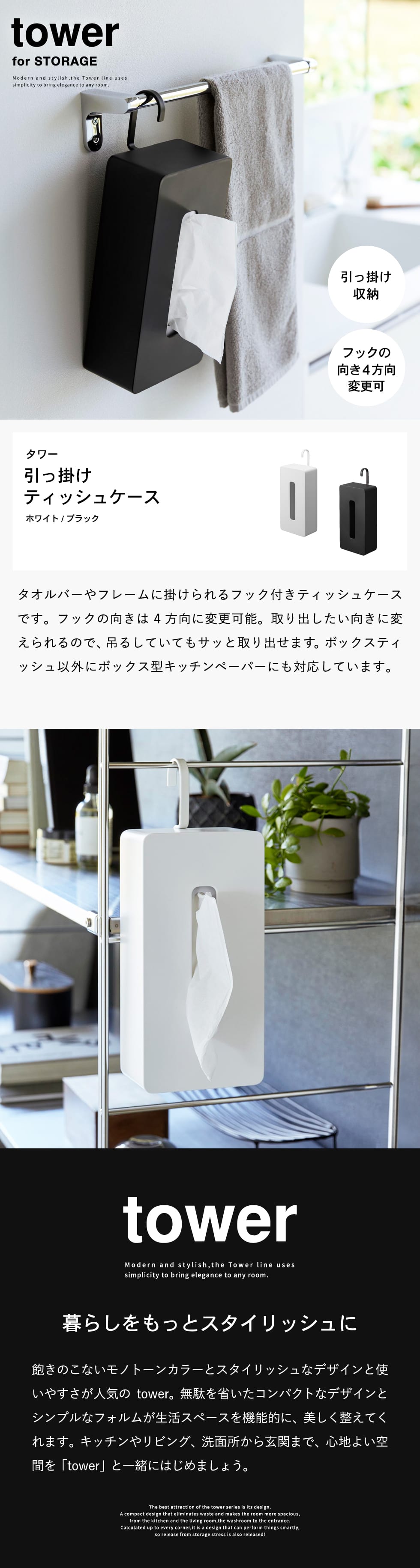 ホワイトとブラックを中心とした飽きのこないモノトーンカラーと、どんなインテリアにもスッと馴染むスタイリッシュなデザイン。そして、とことんシンプルながら、より豊かな暮らしを提案するアイデアがたくさん詰まった、使いやすいアイテムが人気です。無駄を省いたコンパクトなデザインと、シンプルなフォルムが生活スペースを機能的に、美しく整えてくれます。towerのアイテムをライン使いすれば、すっきりとした統一感が生まれ、お洒落でシックな雰囲気を演出します。キッチンやリビング、洗面所から玄関まで揃えたくなるtowerシリーズで、毎日の暮らしを彩る心地よい空間を。