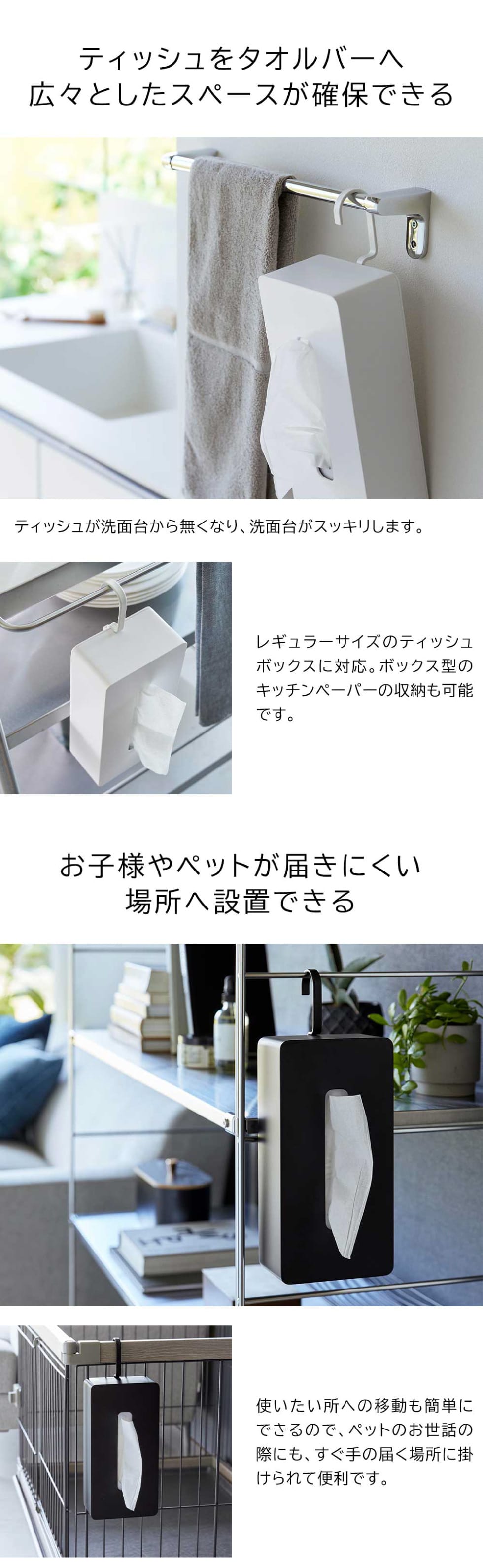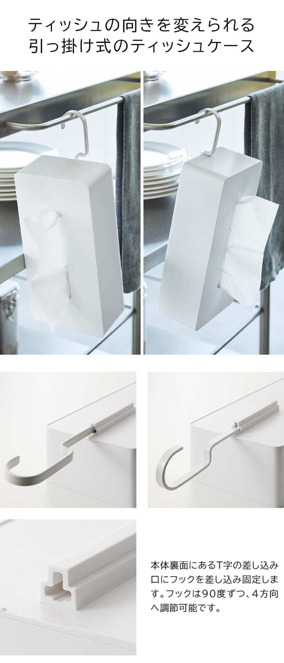 キッチンや洗面タオルバー、ペットケージのフレームに掛けられるフック付きのティッシュケースです。台座背面のフック差し込み口はT字で向きを90°ずつ調整でき、4方向に変更可能。ティッシュを取りやすい向きに変えられるので、吊るしていてもサッと取り出せます。レギュラーサイズのボックスティッシュに対応。他にもボックス型のキッチンペーパーにも対応しています。