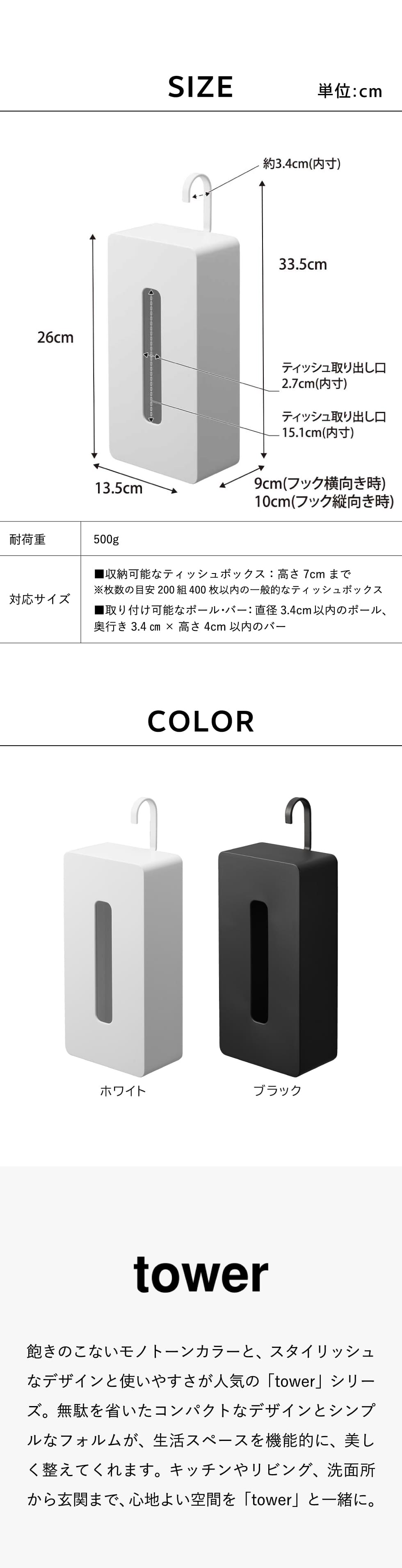 対応サイズ 収納可能なティッシュボックス:高さ7cmまでの一般的なティッシュボックス ※枚数の目安:200組(400枚)以内 取り付け可能なポール・バー:直径3.4cm以内のポール・D3.4×H4cm以内のバー |